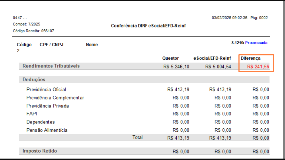 Essa inconsistência explica a diferença apontada no relatório de conferência, uma vez que a incidência incorreta impacta diretamente a apuração do eSocial e, consequentemente, a comparação com a DIRF.