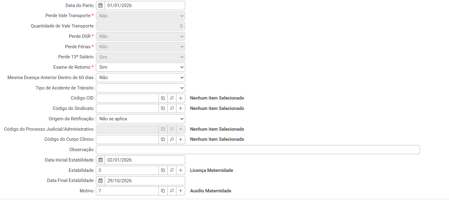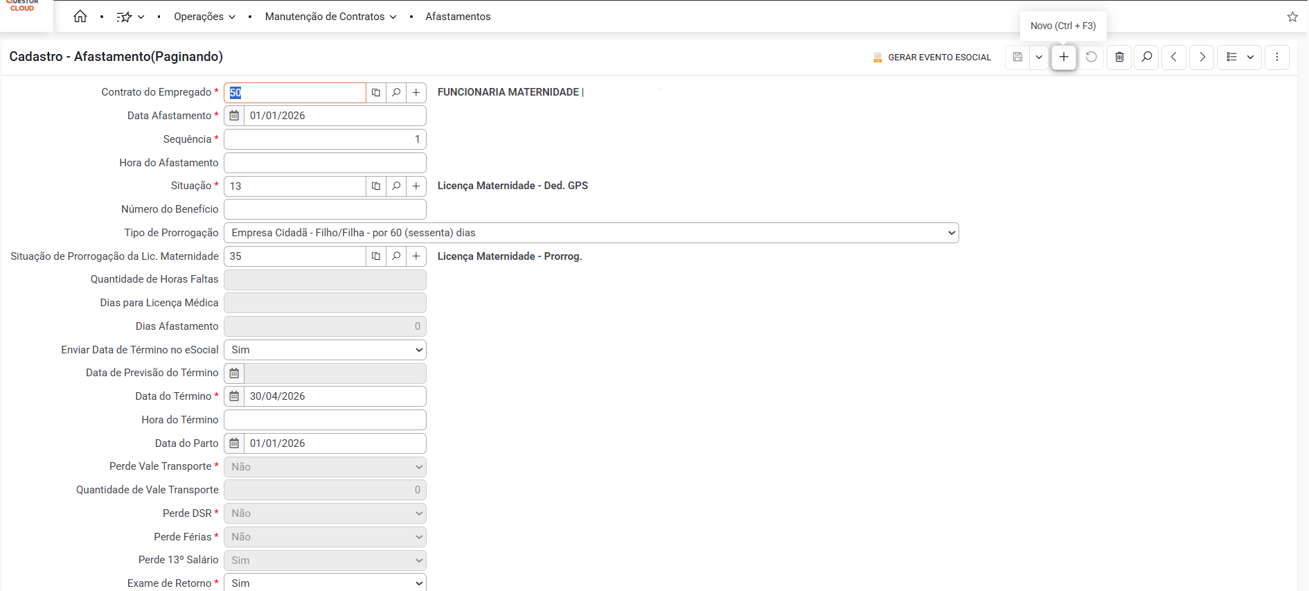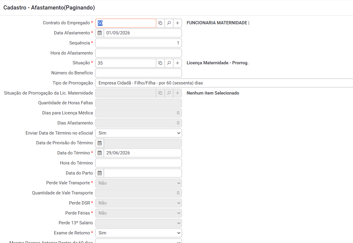 O primeiro cadastro a ser realizado é o do afastamento por licença-maternidade ou licença-paternidade. Com base nos campos preenchidos, o sistema gerará automaticamente a prorrogação do afastamento, quando aplicável.
