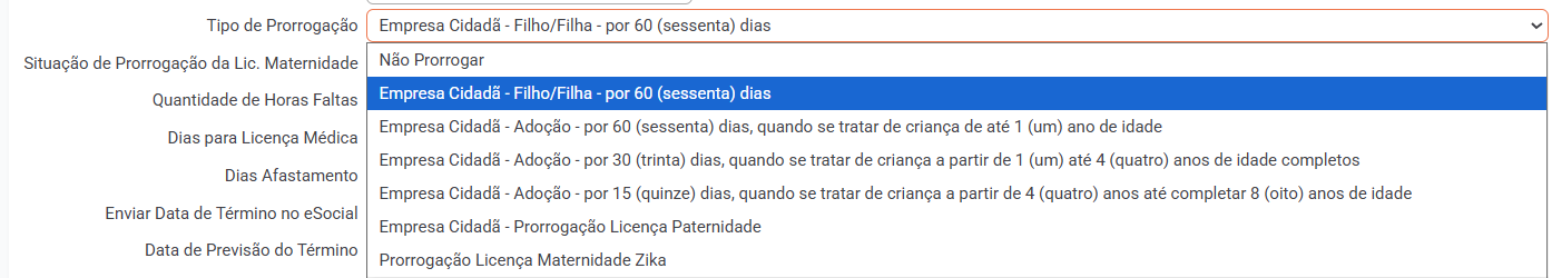 Situação de Prorrogação da Licença-maternidade: o sistema irá gerar automaticamente conforme o tipo de prorrogação.