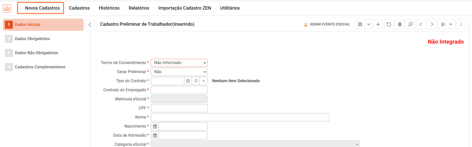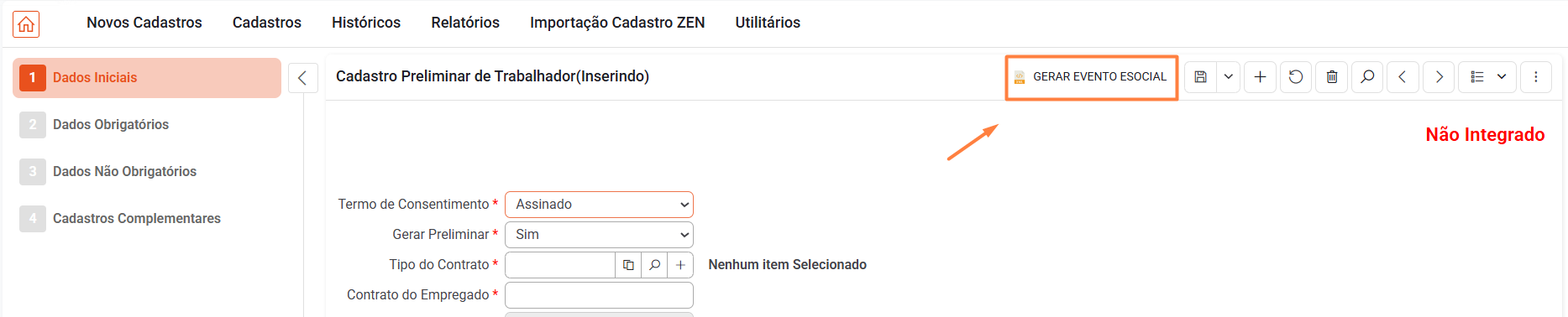 ⚠️Importante: Não deve ser realizado o cadastro preliminar diretamente no portal. Se o usuário não utilizar a rotina do sistema, a transação S-2200 vai rejeitar por falta da informação do número do recibo do registro preliminar.