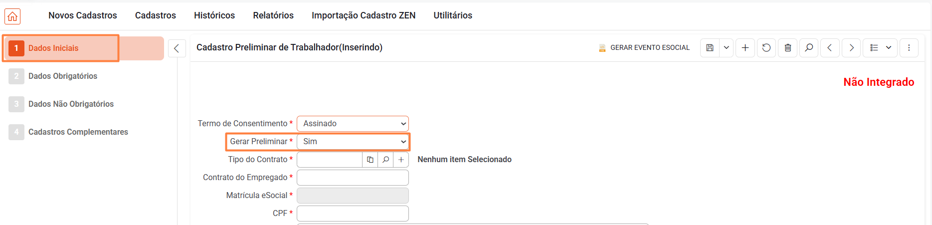 Na opção Novos Cadastros no Item 1 - Dados Inicias, deve ser inserido um novo cadastro, e marcado no campo “Gerar Preliminar” com Sim e preencher os demais dados desse Item.