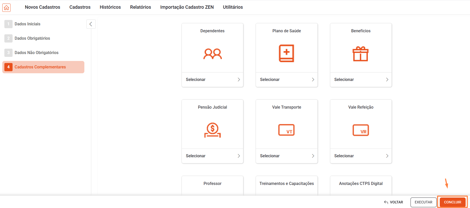 Para gerar o evento S-2200 após o envio do S-2190, é necessário concluir as etapas seguintes da admissão e finalizar o cadastro no passo 4, realizando a integração da admissão.
