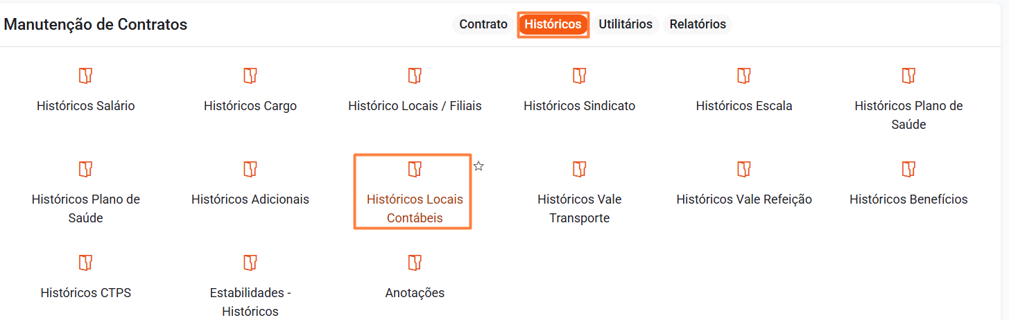1. Acesse o menu: Operação > Folha de Pagamento > Manutenção de Contratos > Históricos Local Contábil.
