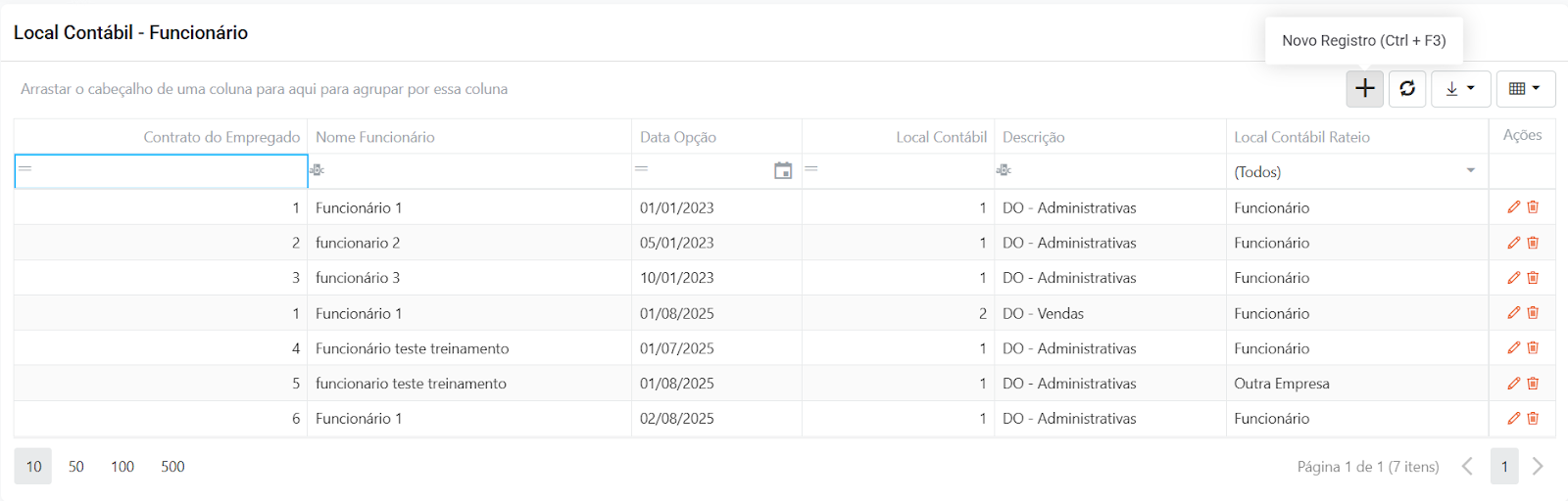 3. Para incluir um novo local contábil, clique no ícone Novo Registro e preencha as informações necessárias.