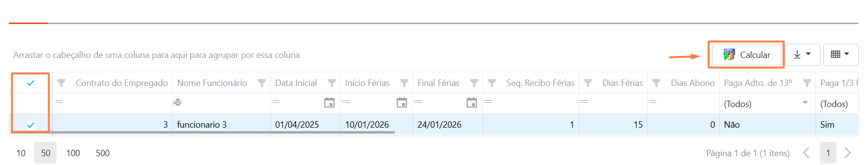 Ao executar sistema vai carregar abaixo os funcionários com férias programadas, marcar o check box para selecionar o funcionário, conforme exemplo e após clicar em Calcular que o sistema irá efetuar o cálculo.