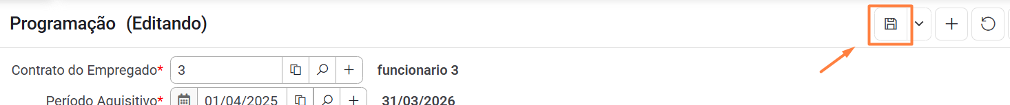 Ao informar o contrato o sistema trará o último período aberto no campo Período Aquisitivo.