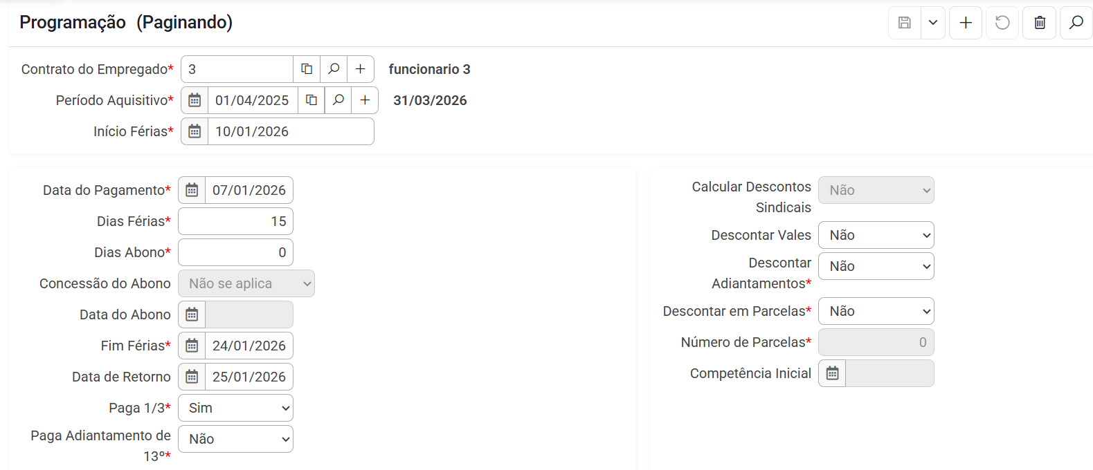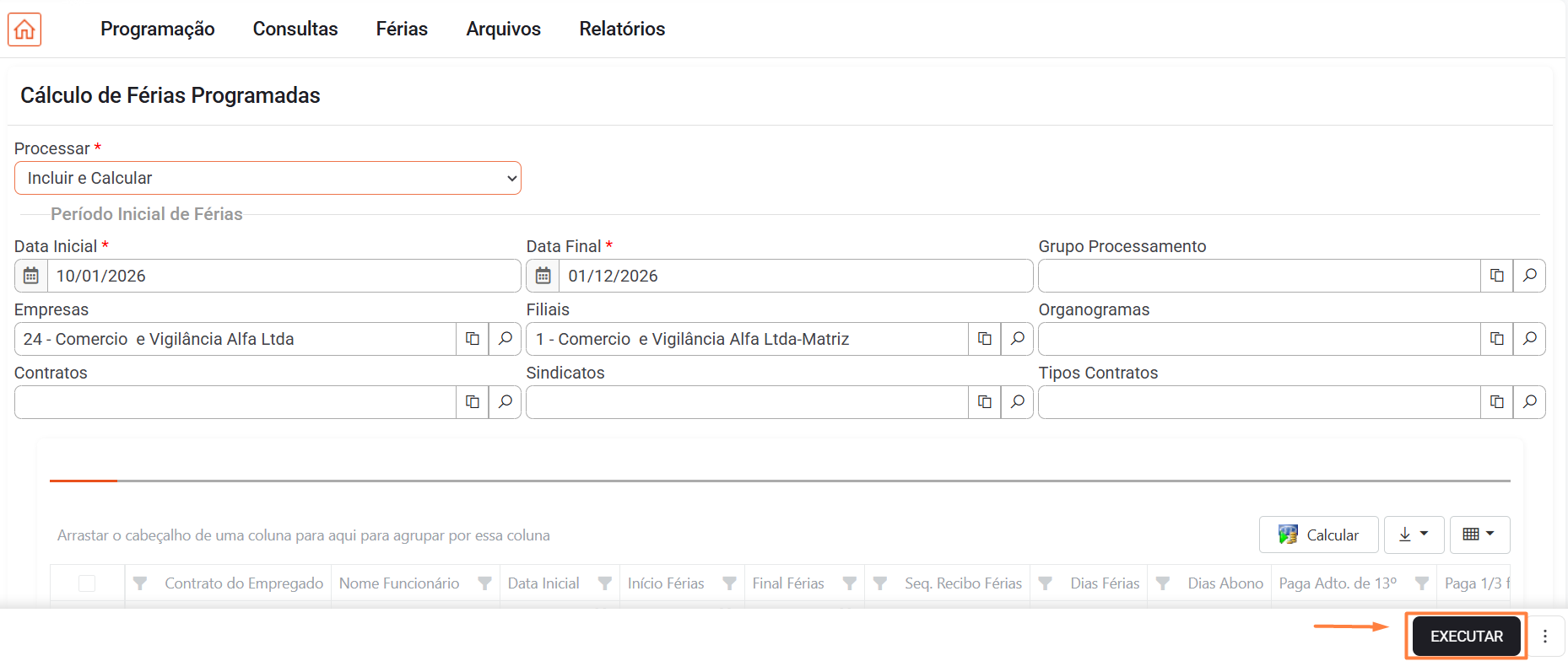 A partir desta opção é possível efetuar todos os cálculos de férias partindo da programação previamente definida pelo usuário.