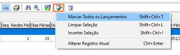 Incluímos uma nova tela de cálculo para férias, esta tem a finalidade de permitir ao usuário efetuar o cálculo de todas as férias programadas para determinada competência. A seleção poderá ser feita para diversas empresas ou grupo de processamento. Na tela de seleção o usuário poderá marcar um ou todos os funcionários da empresa. Algumas teclas de atalho auxiliam nos processos de seleção e cálculo: