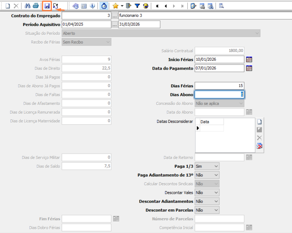 Informe se irá descontar adiantamentos feitos em Funcionários > Férias > Adiantamento;