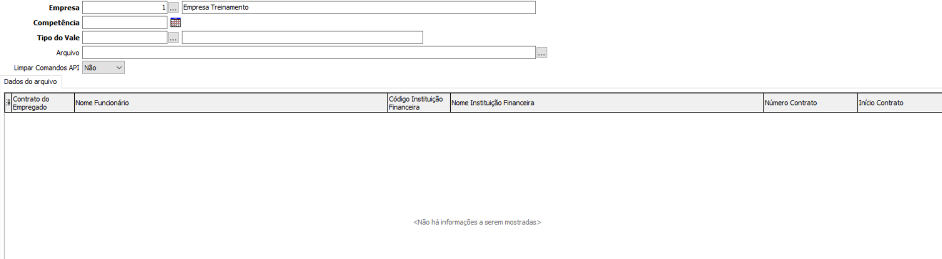 Essa funcionalidade está acessível no menu de Importação do Arquivo e permite que o sistema realize a busca automática por meio da API, desde que os campos Empresa, Competência e Tipo do Vale estejam devidamente preenchidos.