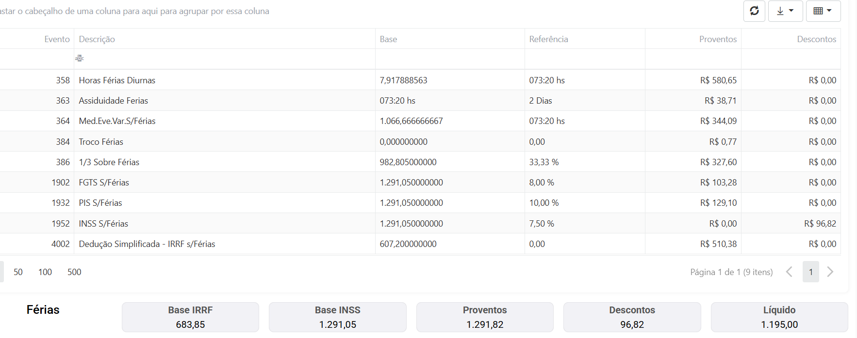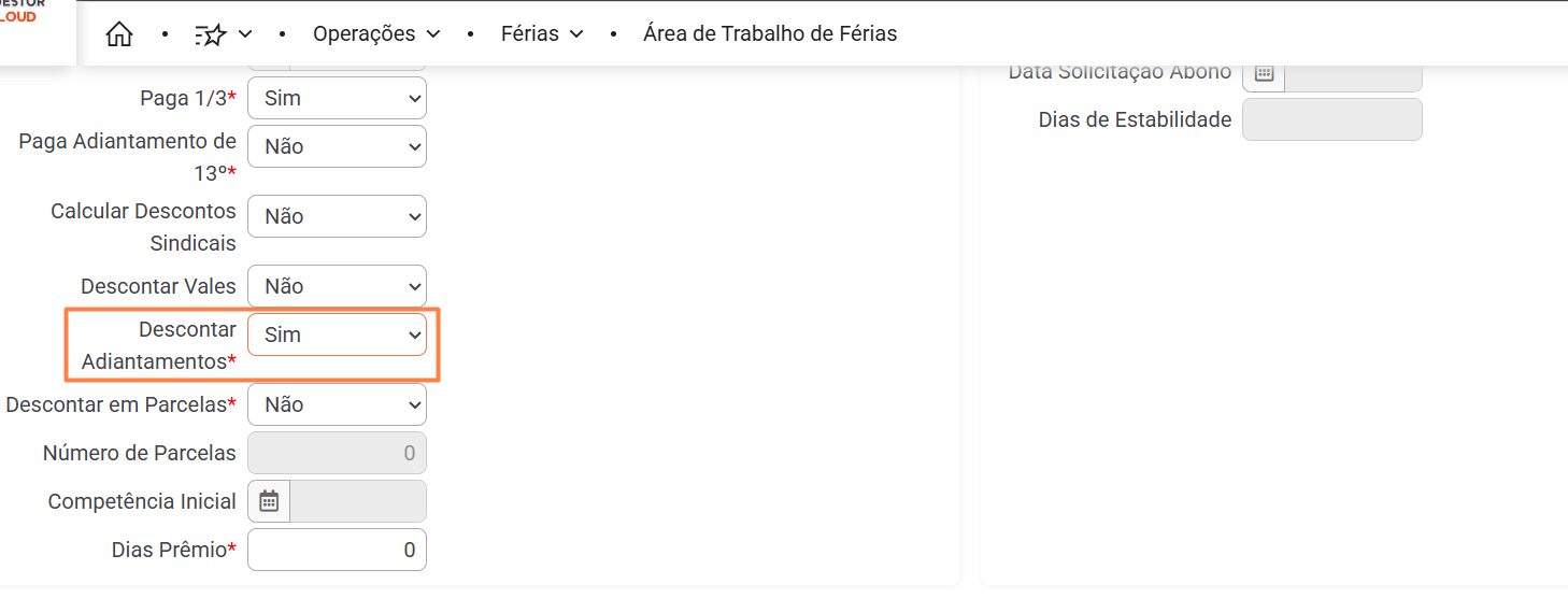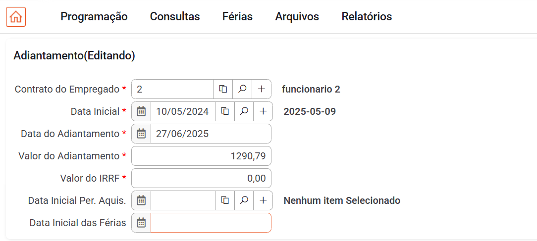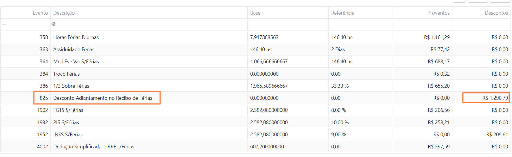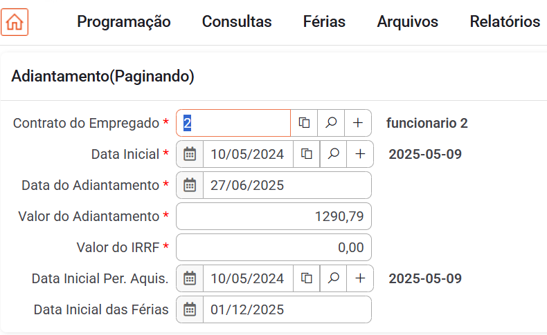 O valor líquido das férias, que foi pago à funcionária em montante superior ao devido, pode ser lançado na rotina de Adiantamento. Assim, ao calcular o recibo de férias referente ao saldo restante de dias após o término da licença-maternidade, o sistema aplicará automaticamente o desconto correspondente, levando em consideração que o valor já foi antecipado.