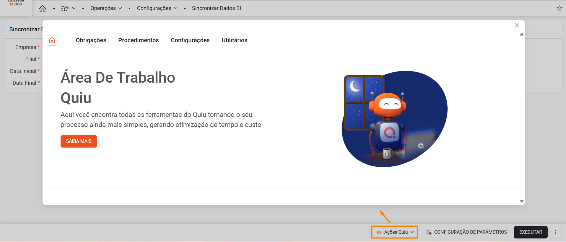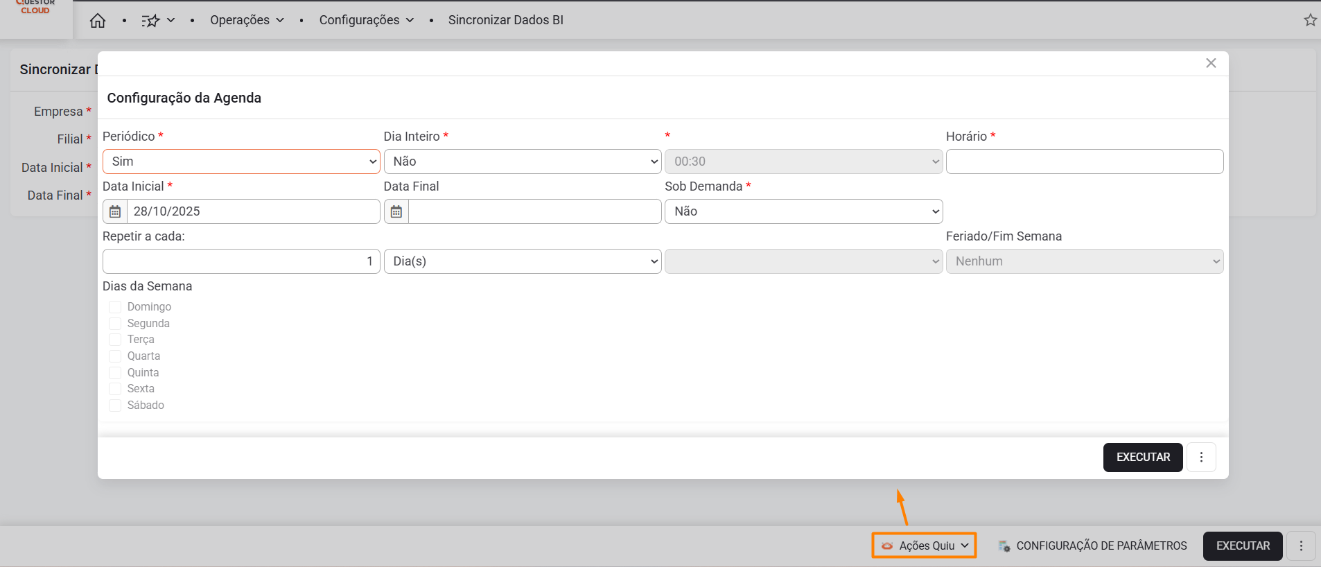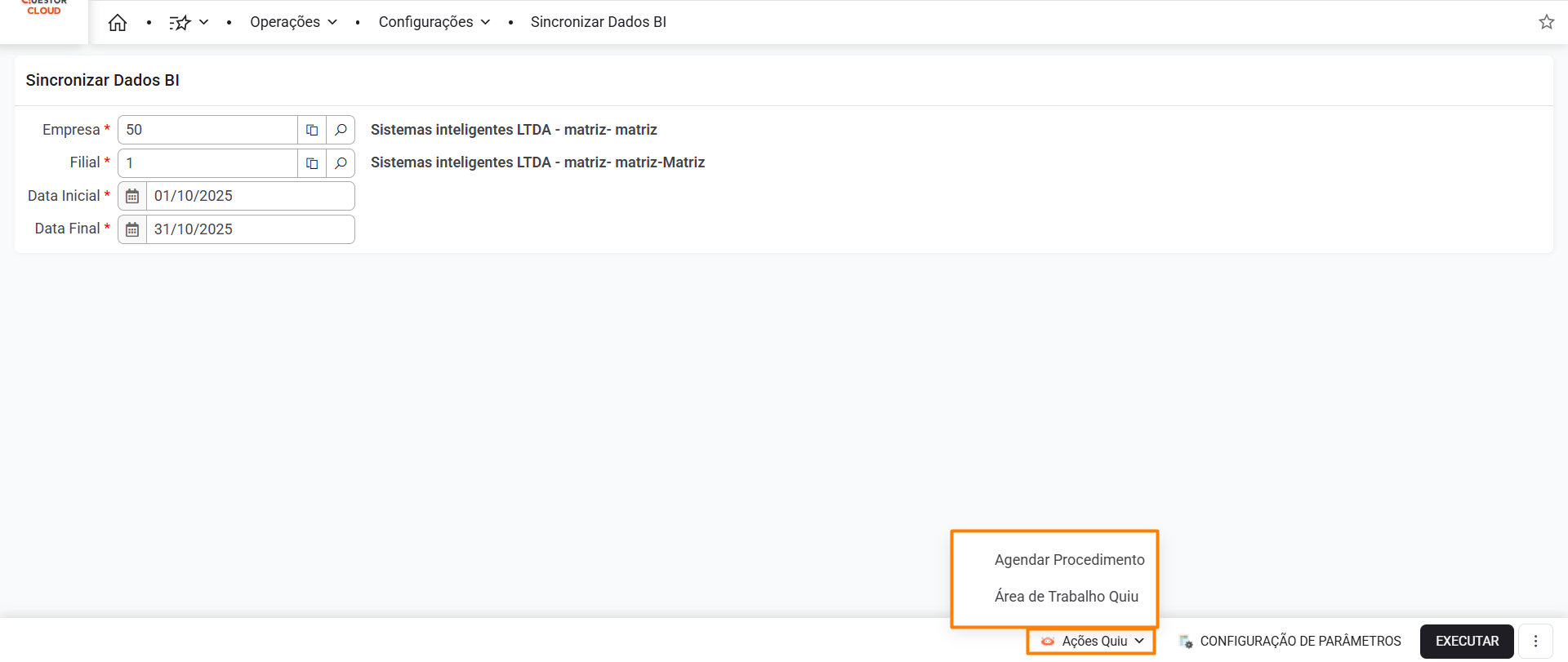 Esta rotina tem como objetivo sincronizar os dados de BI na base da Questor. Para o agendamento, será necessário acessar a rotina: Operações > Gerenciador de Empresas > Áreas de Trabalho Quiu > Procedimentos > Agendar.