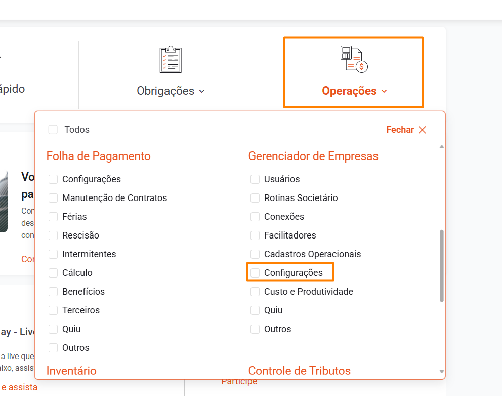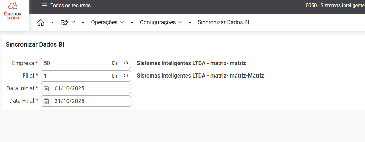 1. Acesse a rotina da Sincronização de dados BI em Operações> Gerenciador de empresas> Configurações > Sincronização de Dados BI.