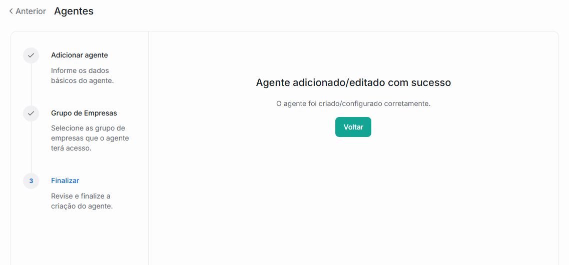 Nessa tela, será exibida uma mensagem de sucesso informando que o agente foi criado.