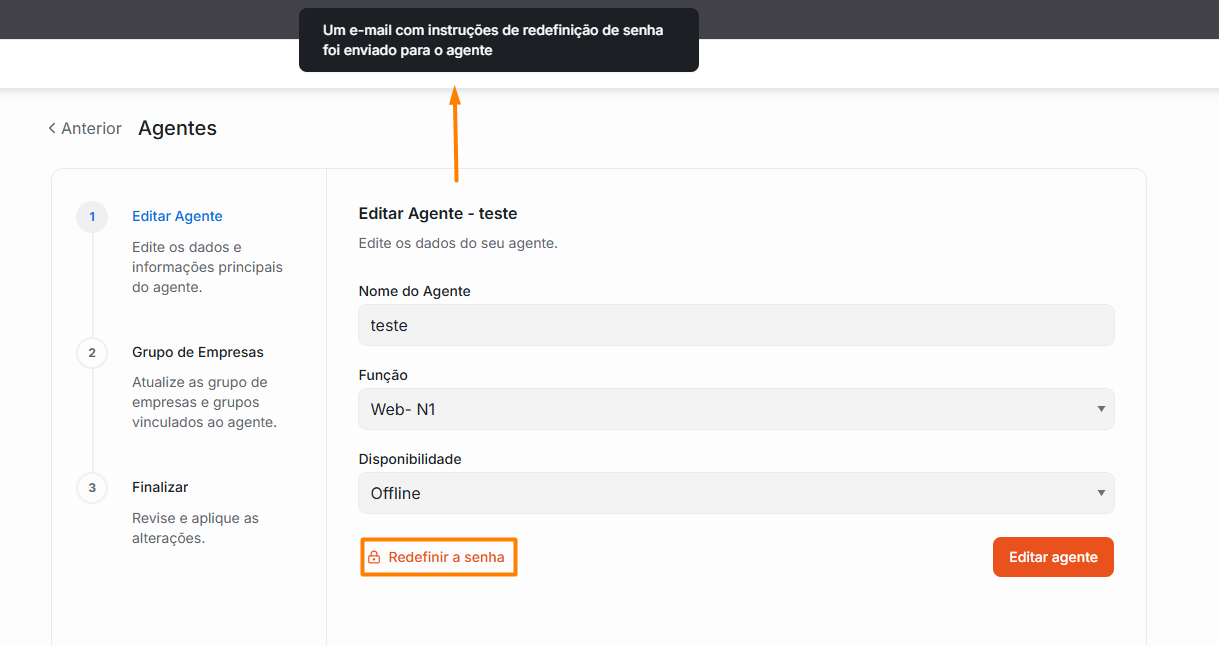 Além disso, para redefinir a senha do usuário, clique no botão “Redefinir a senha”. O sistema enviará automaticamente um e-mail com as instruções de redefinição.