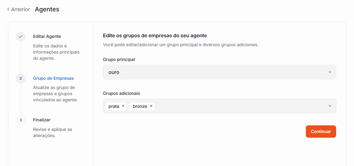 Ao finalizar os ajustes necessários, clique no botão Editar agente para ser direcionado à próxima aba.