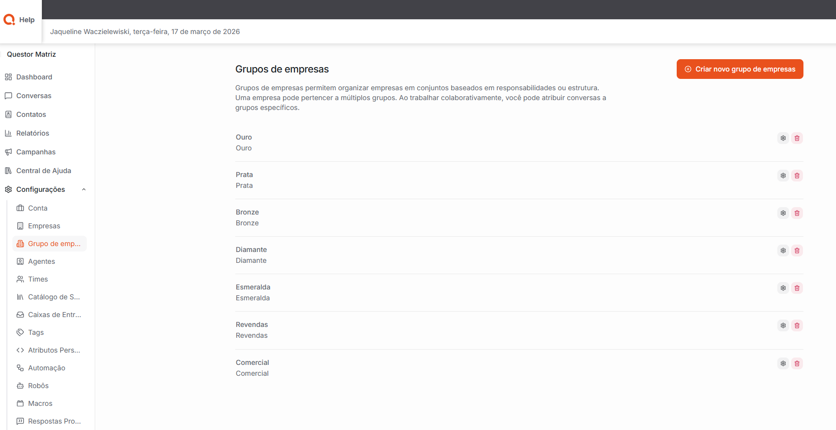 Grupo de empresas: Permite organizar diferentes empresas em grupos, facilitando o gerenciamento e a visualização das empresas vinculadas dentro da plataforma.