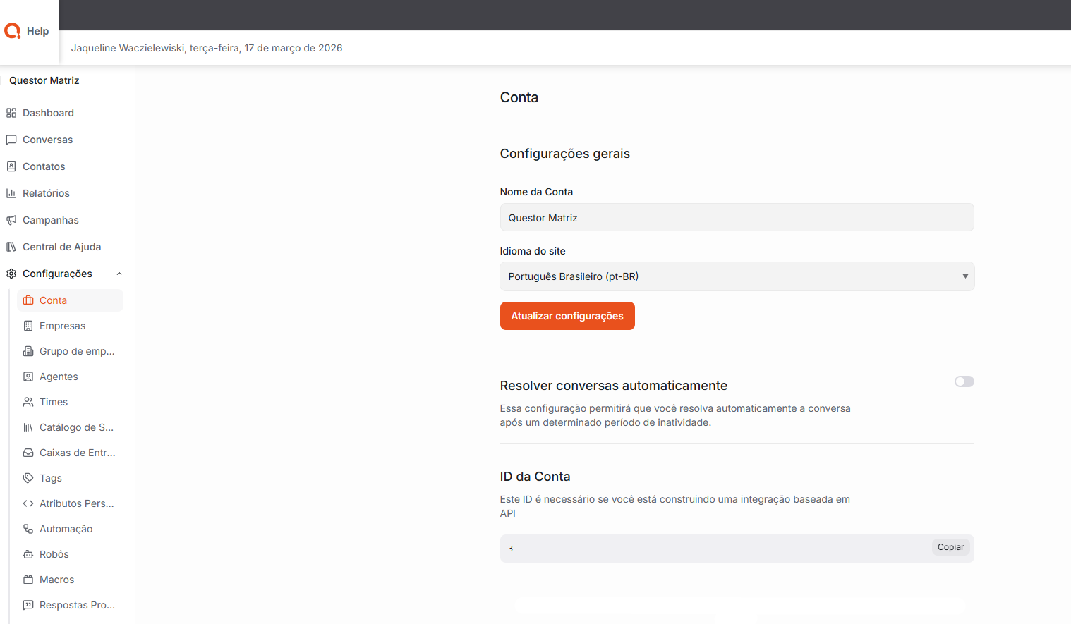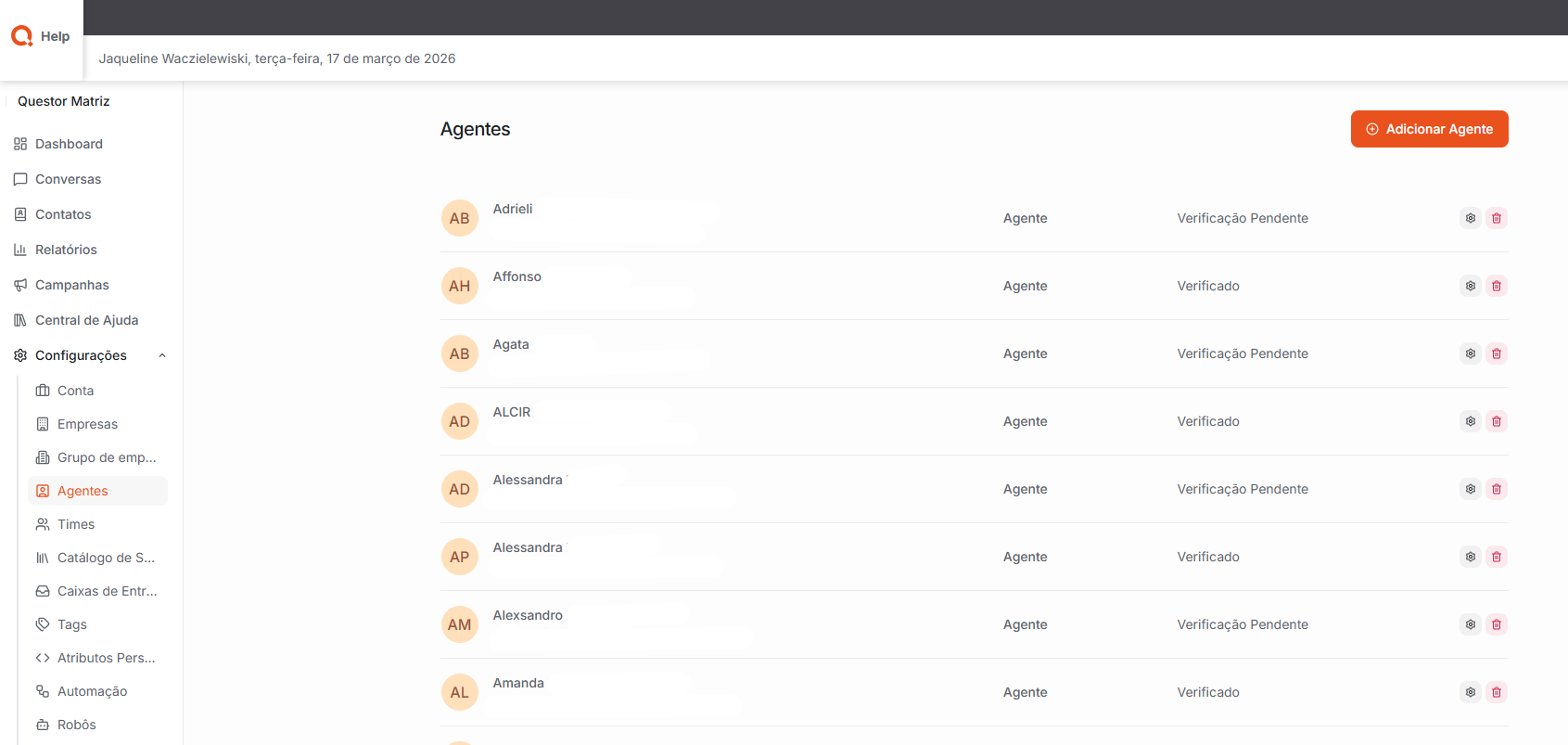 Agentes: Nesta área, é possível gerenciar os usuários que atuam como atendentes no sistema. Aqui podem ser realizados cadastros, edições e configurações de agentes, além da definição de permissões, funções e acessos dentro da plataforma. Essa configuração permite organizar os atendentes e controlar o nível de acesso de cada usuário no sistema.