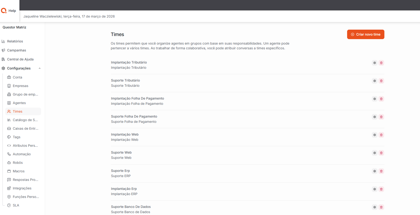 Times: Nesta área, é possível criar e gerenciar os times de atendimento, organizando os agentes em grupos conforme suas funções, setores ou responsabilidades. Essa organização facilita a distribuição das conversas, o direcionamento dos atendimentos e o acompanhamento do desempenho das equipes dentro da plataforma.