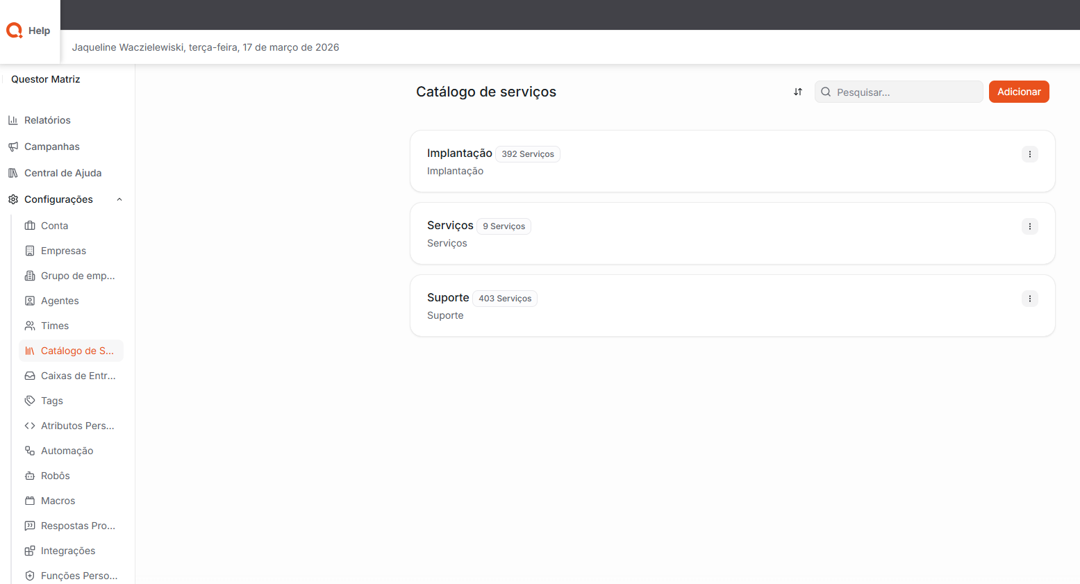 Catálogo de serviços: Nesta área, é possível criar e gerenciar os serviços oferecidos pela empresa dentro do sistema. O catálogo permite organizar e categorizar os serviços, facilitando a identificação e o direcionamento correto dos atendimentos. Dessa forma, os agentes conseguem selecionar ou associar o serviço adequado durante o atendimento, contribuindo para uma melhor organização e controle das demandas.