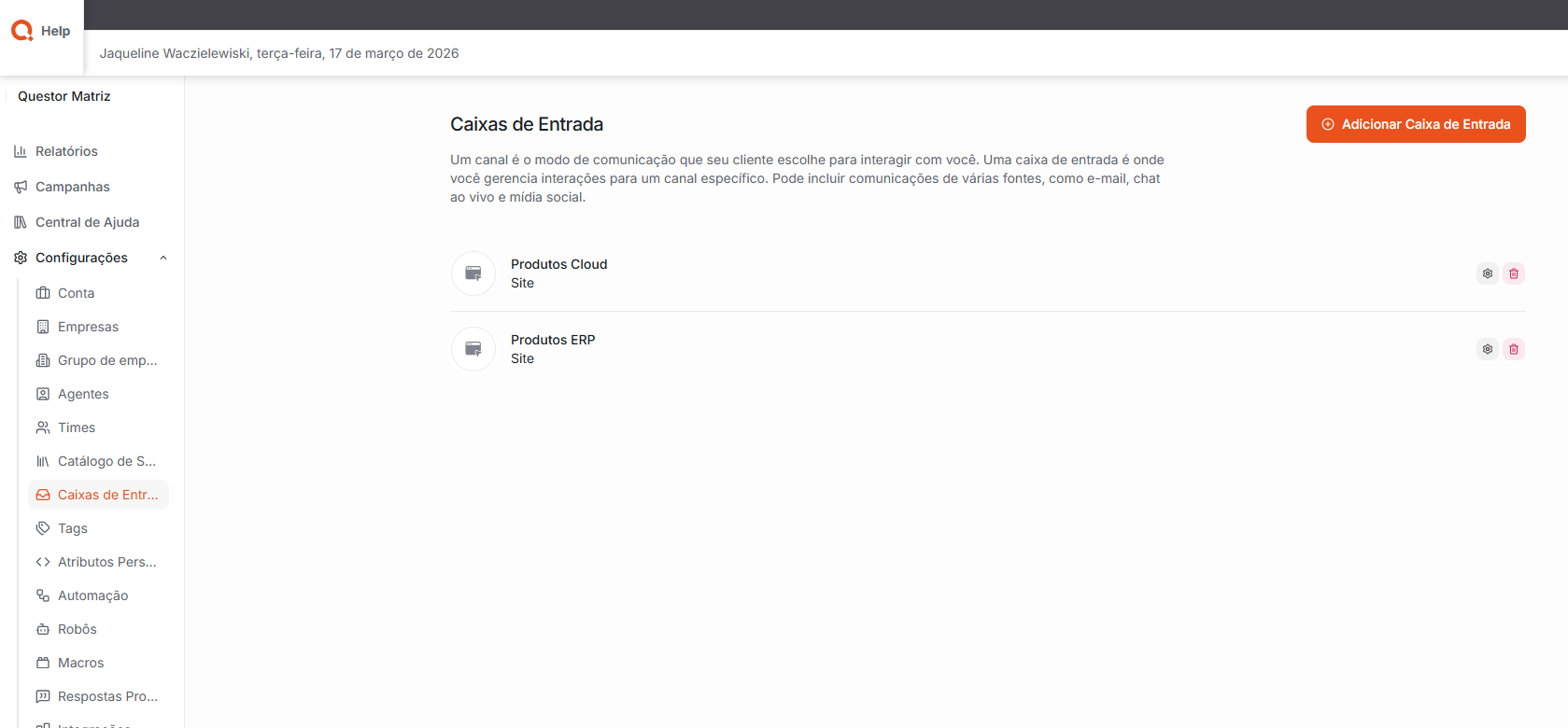 Caixa de Entrada: Refere-se ao local onde são gerenciadas as interações dos clientes, organizadas de acordo com o canal de comunicação utilizado, como e-mail,chat ao vivo ou redes sociais. Cada canal representa a forma como o cliente escolhe interagir com a empresa, e a caixa de entrada centraliza essas comunicações, permitindo visualizar, organizar e responder às mensagens de forma prática e eficiente.