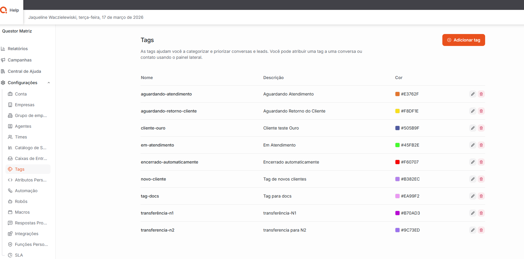 Tags: Nesta área, é possível criar e gerenciar tags utilizadas para classificar e organizar atendimentos e clientes dentro do sistema. As tags permitem identificar conversas por categorias específicas, facilitando a busca, o filtro e o acompanhamento das interações. Dessa forma, é possível organizar melhor os atendimentos e localizar informações de maneira mais rápida.