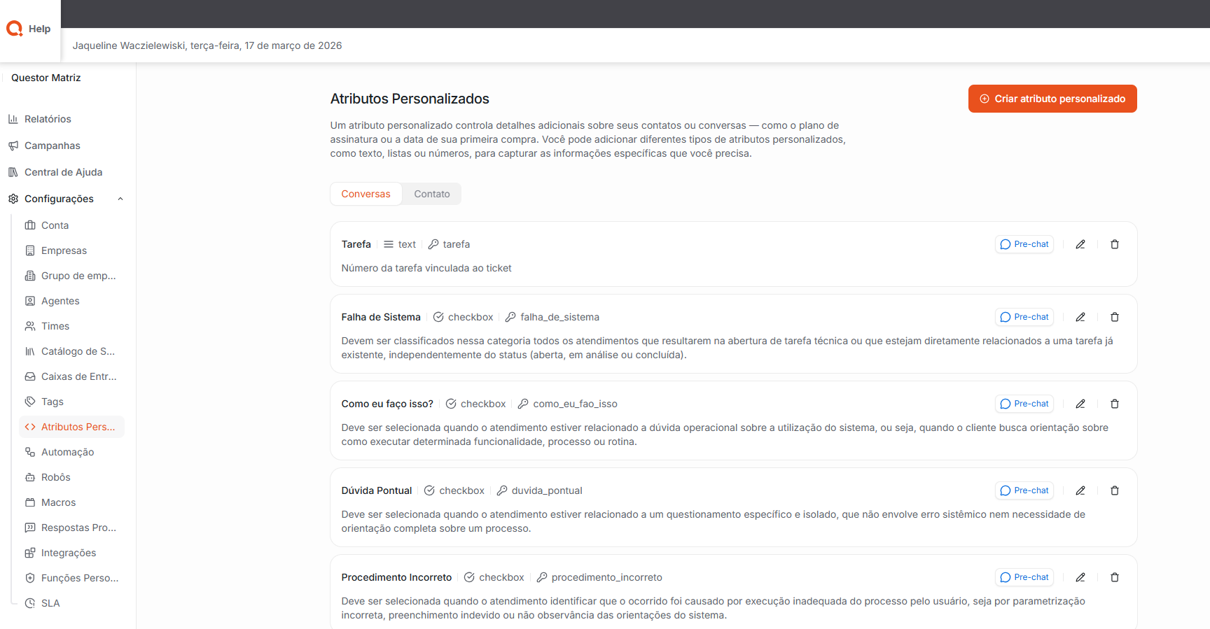 Atributos Personalizados: Nesta área, é possível criar e gerenciar atributos personalizados, que permitem registrar informações adicionais sobre contatos ou conversas no sistema.