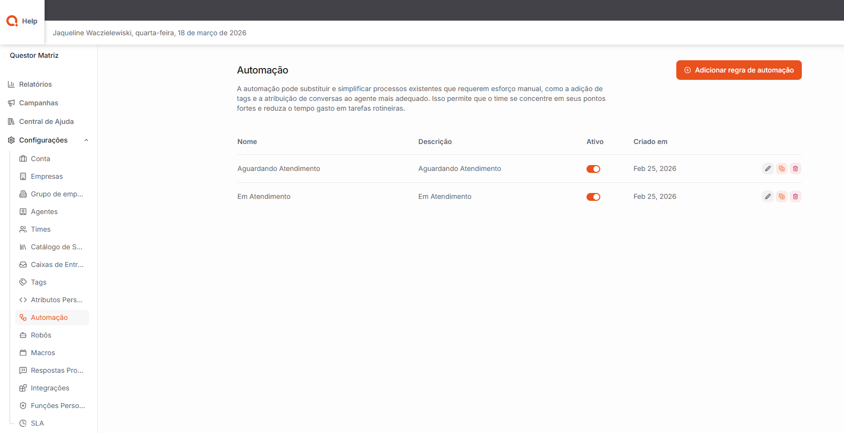 Automação: Permite criar e gerenciar automações que substituem e simplificam processos que exigem esforço manual, como a adição de tags e a atribuição de conversas ao agente mais adequado.