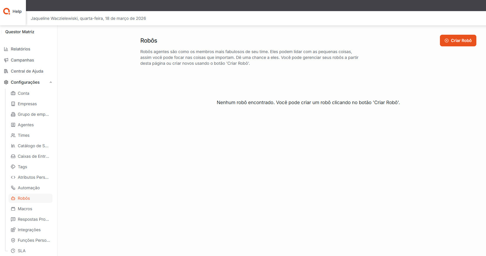 Robôs: Permite criar e gerenciar robôs de atendimento, que atuam como agentes automatizados para auxiliar nas interações com os clientes.