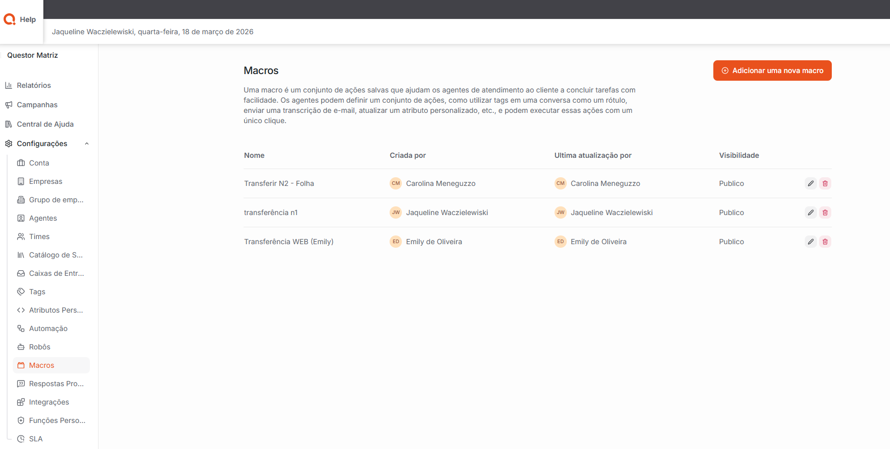Macros: Permite criar e gerenciar ações automáticas predefinidas, que podem ser executadas durante os atendimentos para agilizar tarefas recorrentes. As macros podem incluir ações como envio de respostas prontas, adição de tags, alteração de status das conversas e atribuição a agentes ou times, facilitando a padronização e aumentando a produtividade no atendimento.