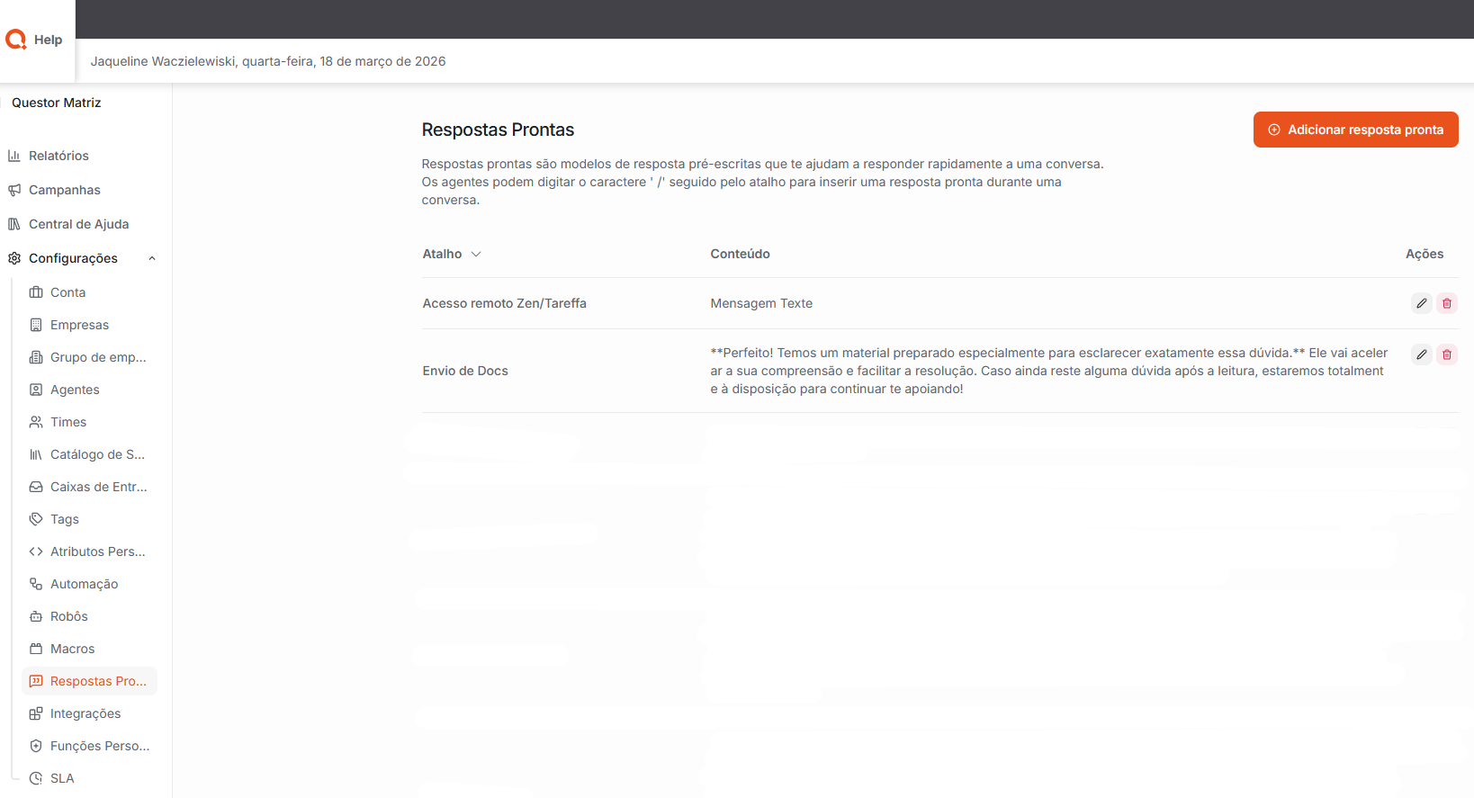Respostas Prontas: São modelos de mensagens pré-escritas que auxiliam no envio rápido de respostas durante um atendimento.
