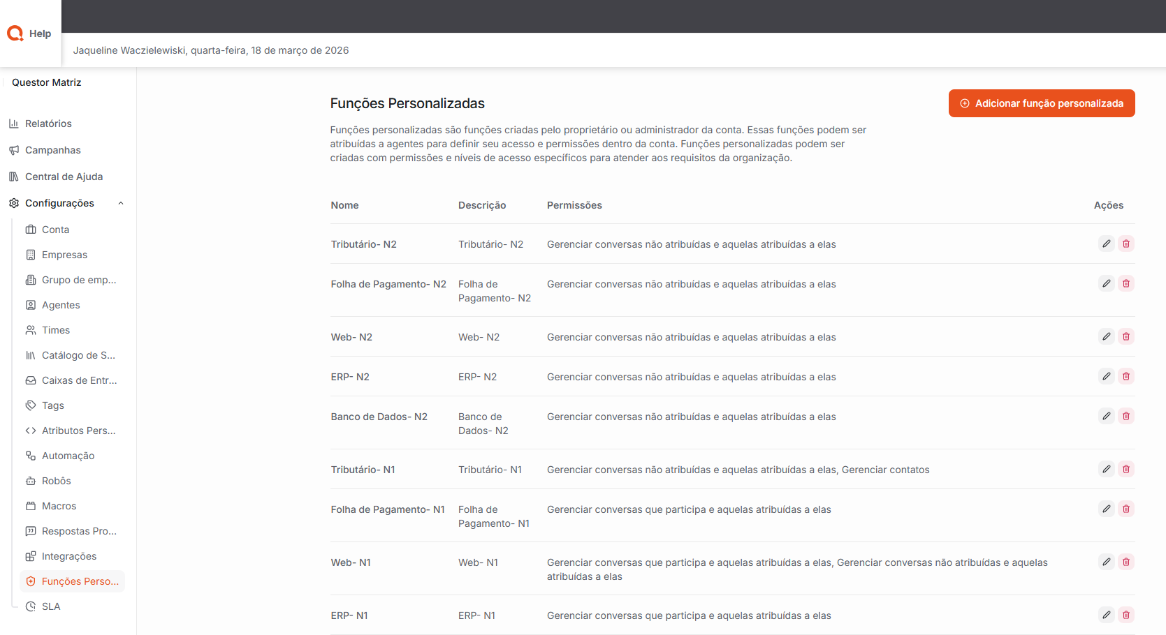 Funções Personalizadas: Nesta área, é possível criar e gerenciar funções personalizadas, definindo níveis de acesso e permissões específicas para os usuários do sistema.