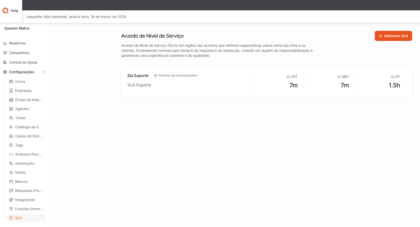 SLA: O Acordo de Nível de Serviço (Service Level Agreement – SLA) define expectativas claras entre o time e os clientes. Ele estabelece regras para os tempos de resposta e de resolução, garantindo maior controle dos atendimentos.