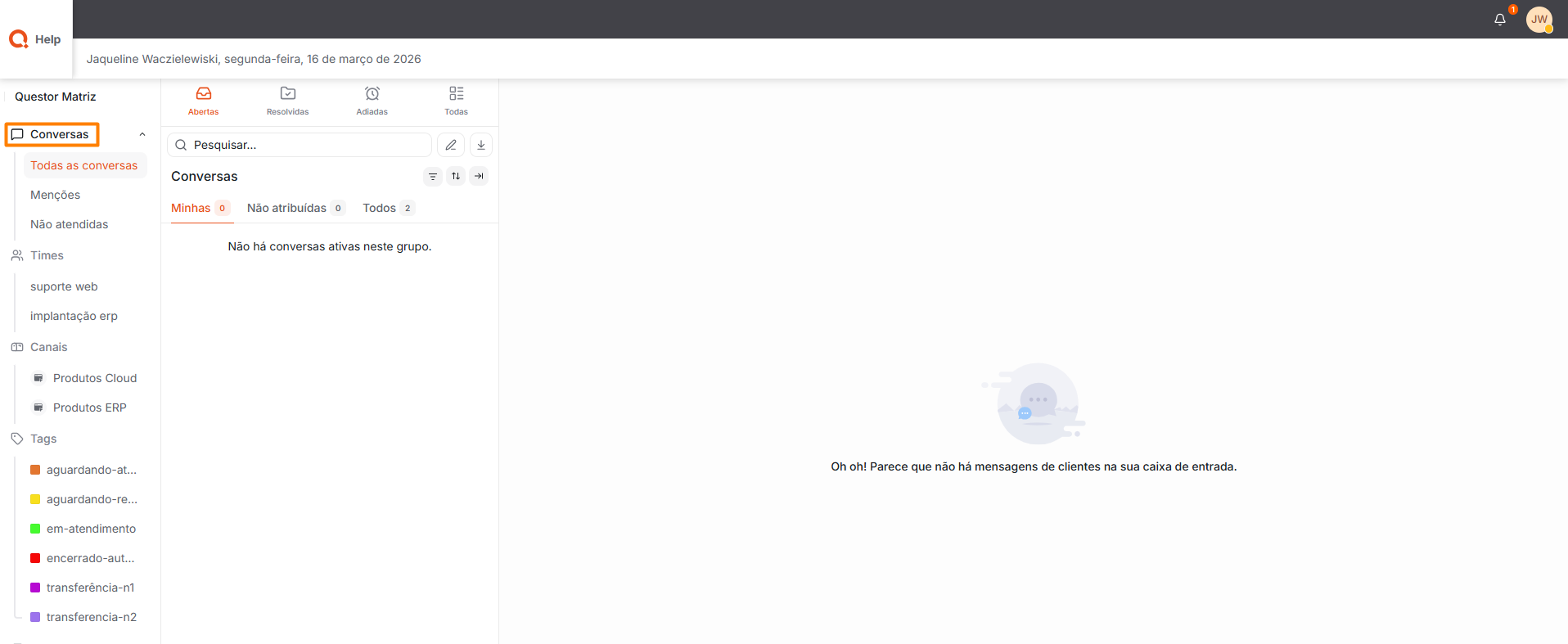 Tags: Exibe as conversas associadas às Tags às quais o usuário logado tem acesso, auxiliando na organização e categorização dos atendimentos.