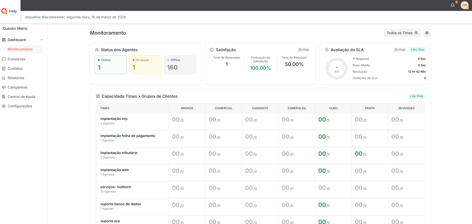 Além disso, a tela permite verificar o status dos agentes (Disponível, Ocupado, Offline, entre outros), acompanhar a satisfação dos atendimentos realizados e monitorar o SLA, garantindo que os prazos definidos para resposta e resolução estejam sendo cumpridos. Dessa forma, o monitoramento auxilia na gestão do atendimento e na tomada de decisões para melhorar a eficiência das equipes.