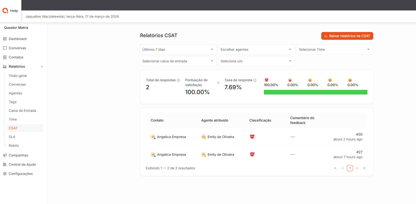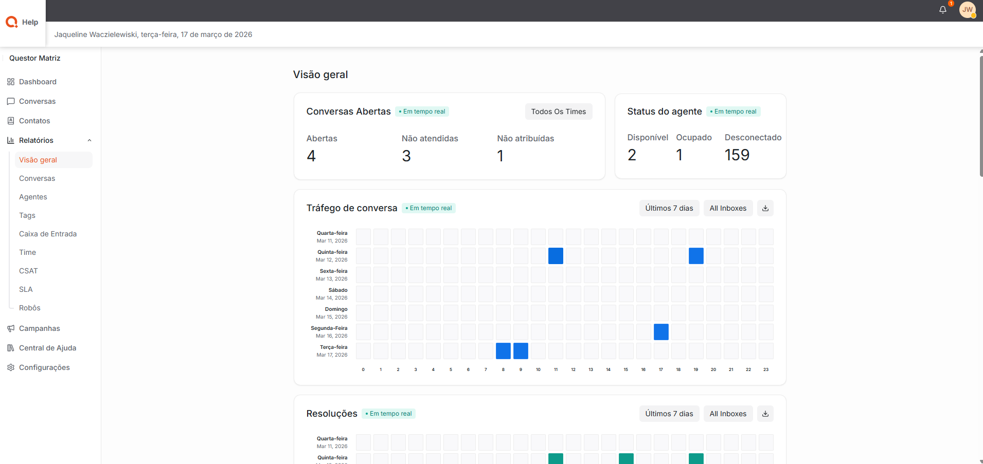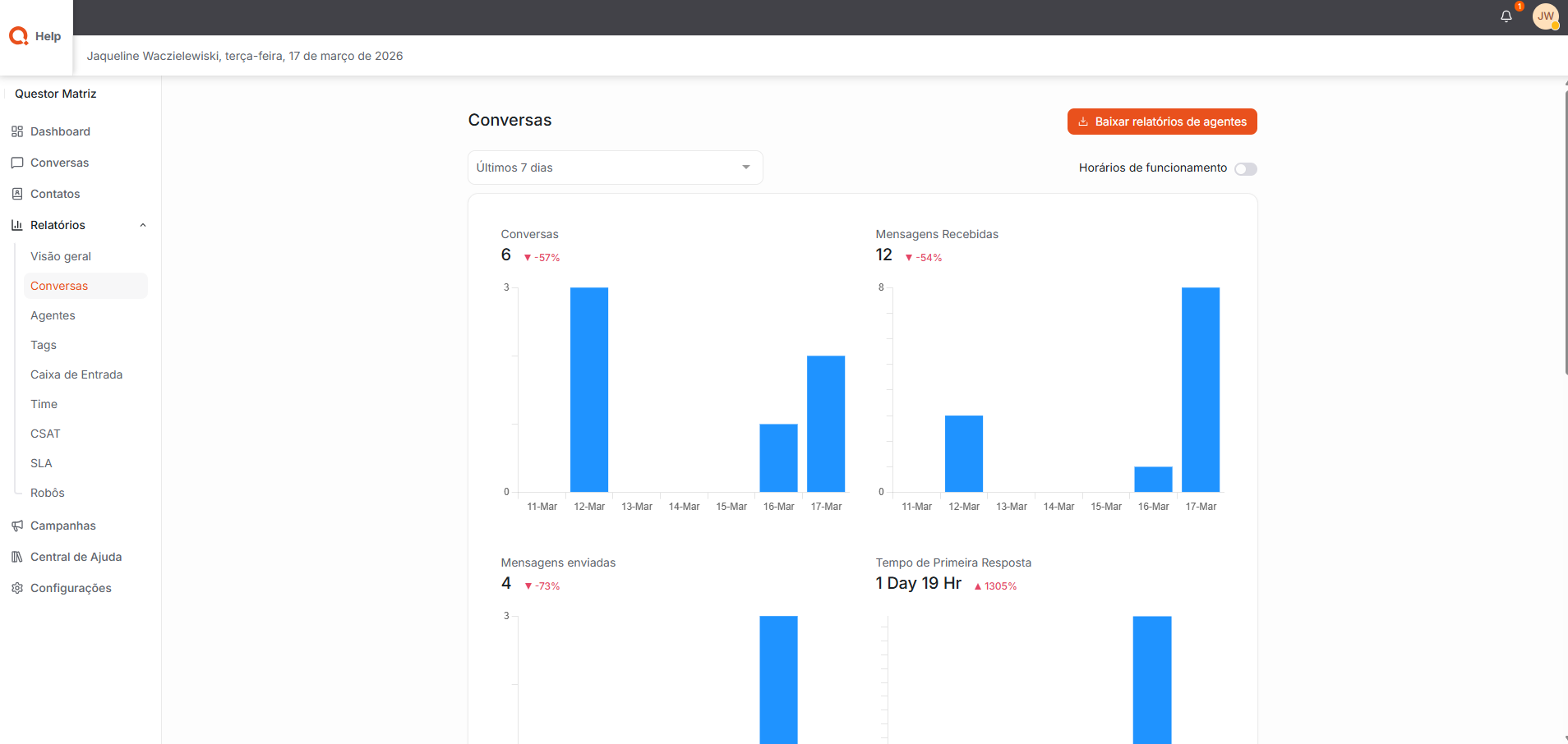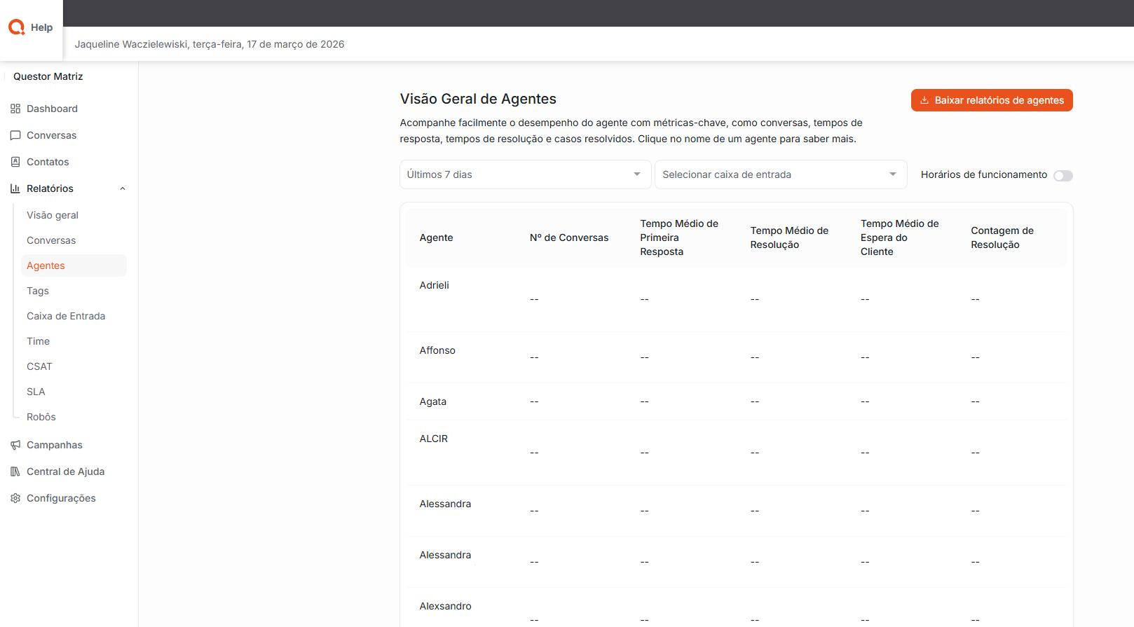 Agentes: Permite acompanhar facilmente o desempenho de cada agente, apresentando informações como quantidade de conversas atendidas, tempos de resposta, tempos de resolução e casos resolvidos.