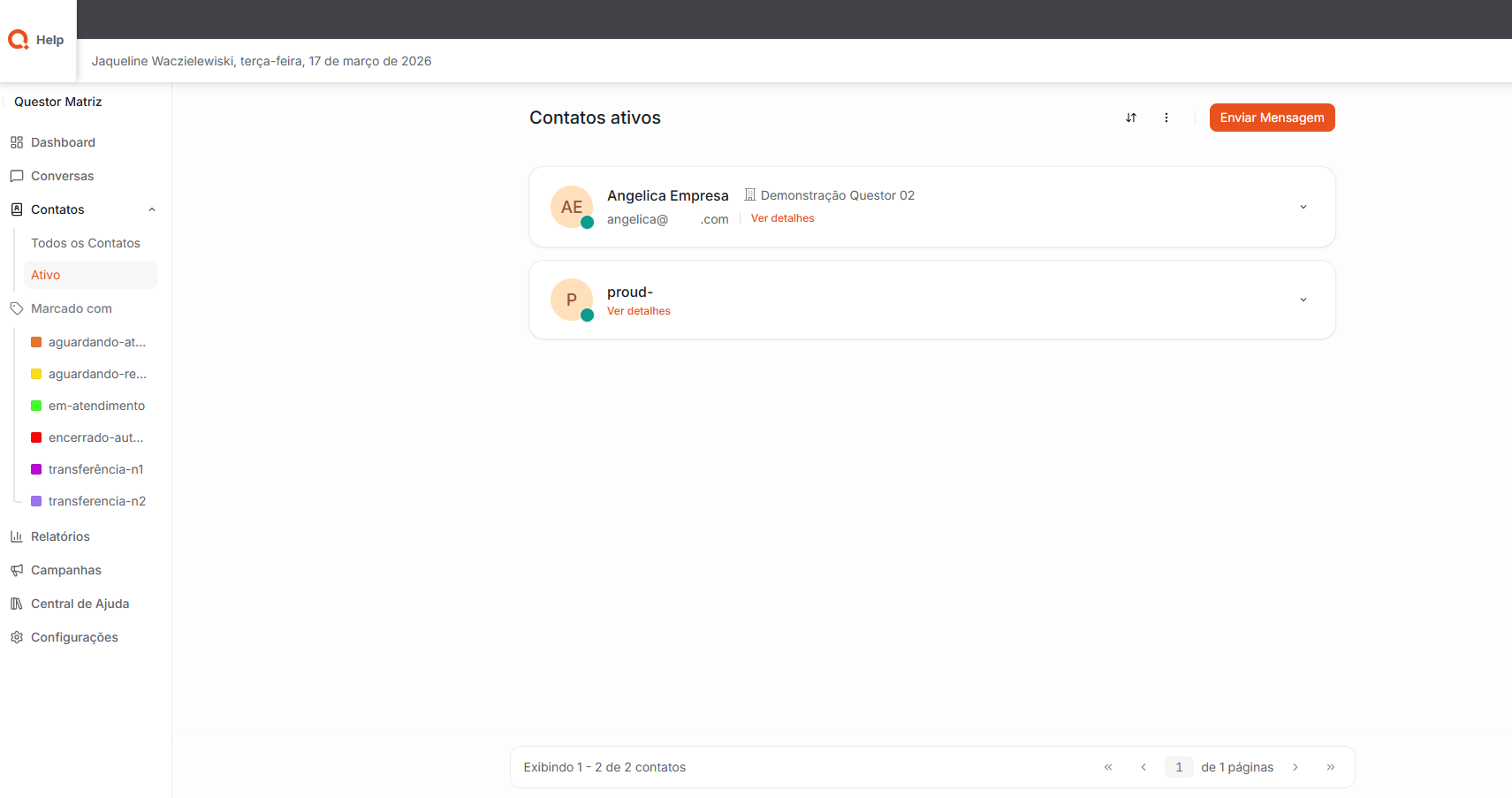 Ativos: Exibe apenas os contatos que estão ativos no sistema, permitindo que o usuário visualize e trabalhe somente com os registros que estão atualmente habilitados para atendimento e interação dentro da plataforma.