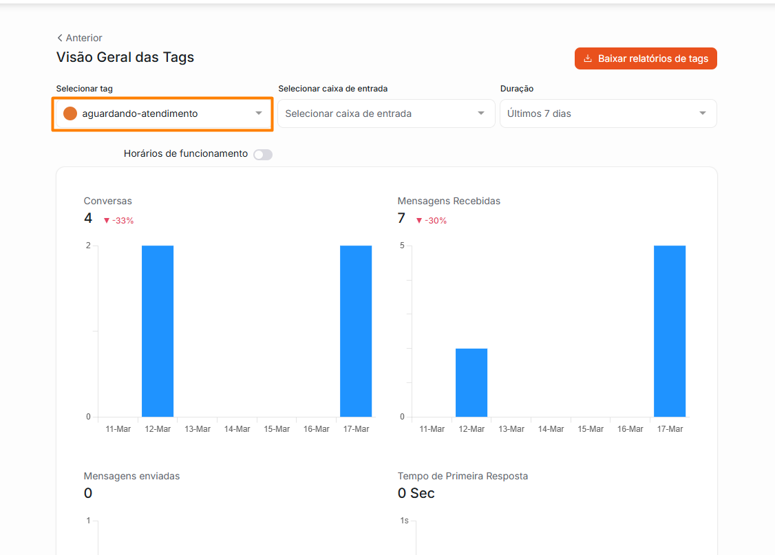 Tags: Permite uma visualização geral das tags, acompanhando informações como quantidade de conversas associadas, tempo de resposta, tempo de resolução e casos resolvidos.