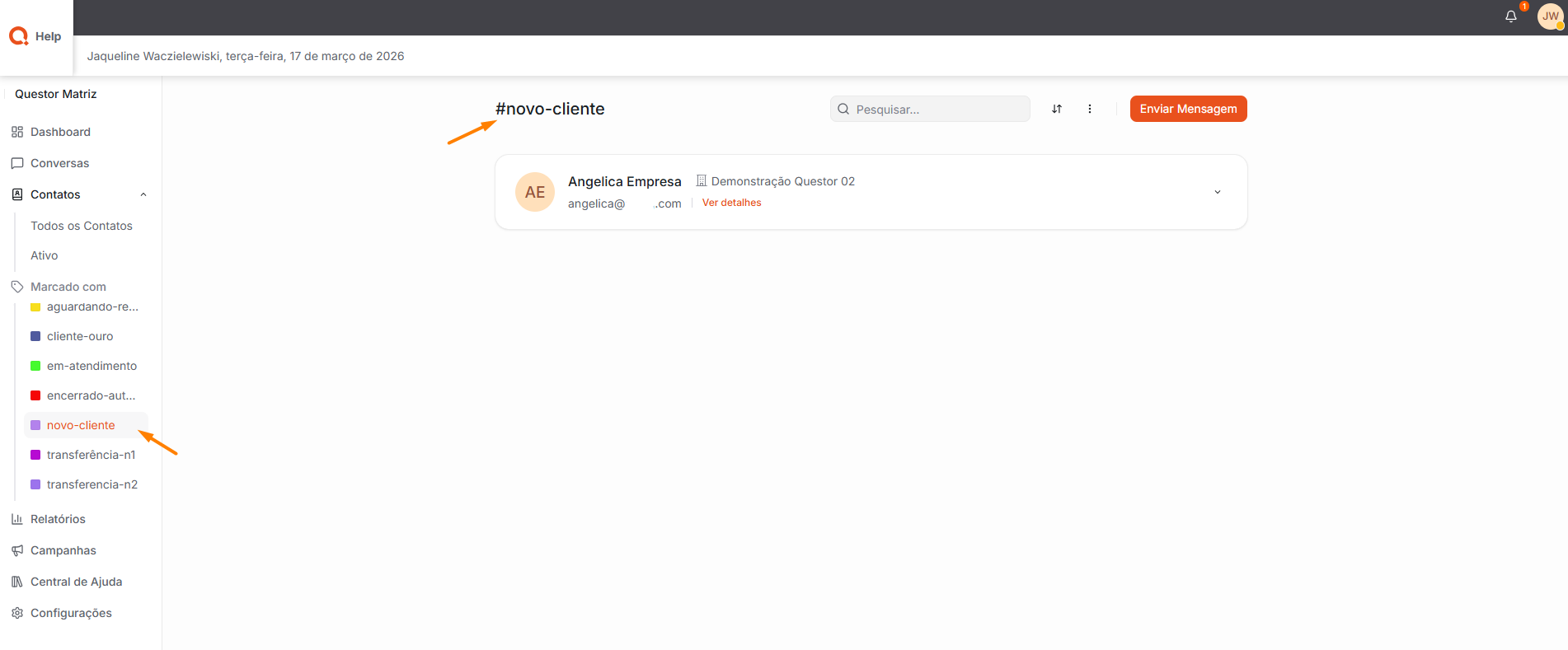 Marcado com: Nesta tela, é possível visualizar os clientes que possuem Tags atribuídas, permitindo identificar e organizar as conversas por categorias específicas, como clientes VIP, novos clientes, entre outros).