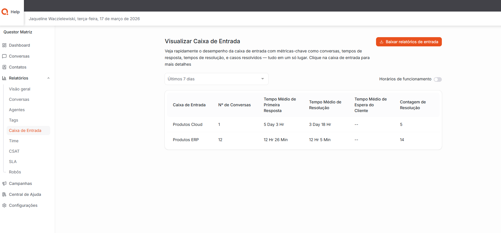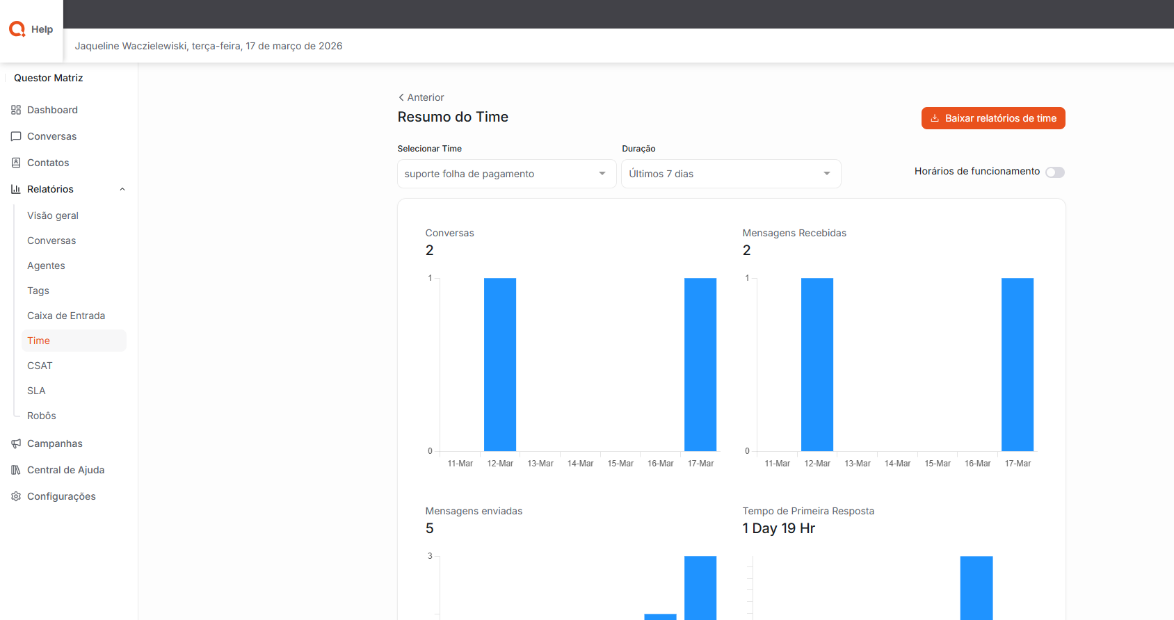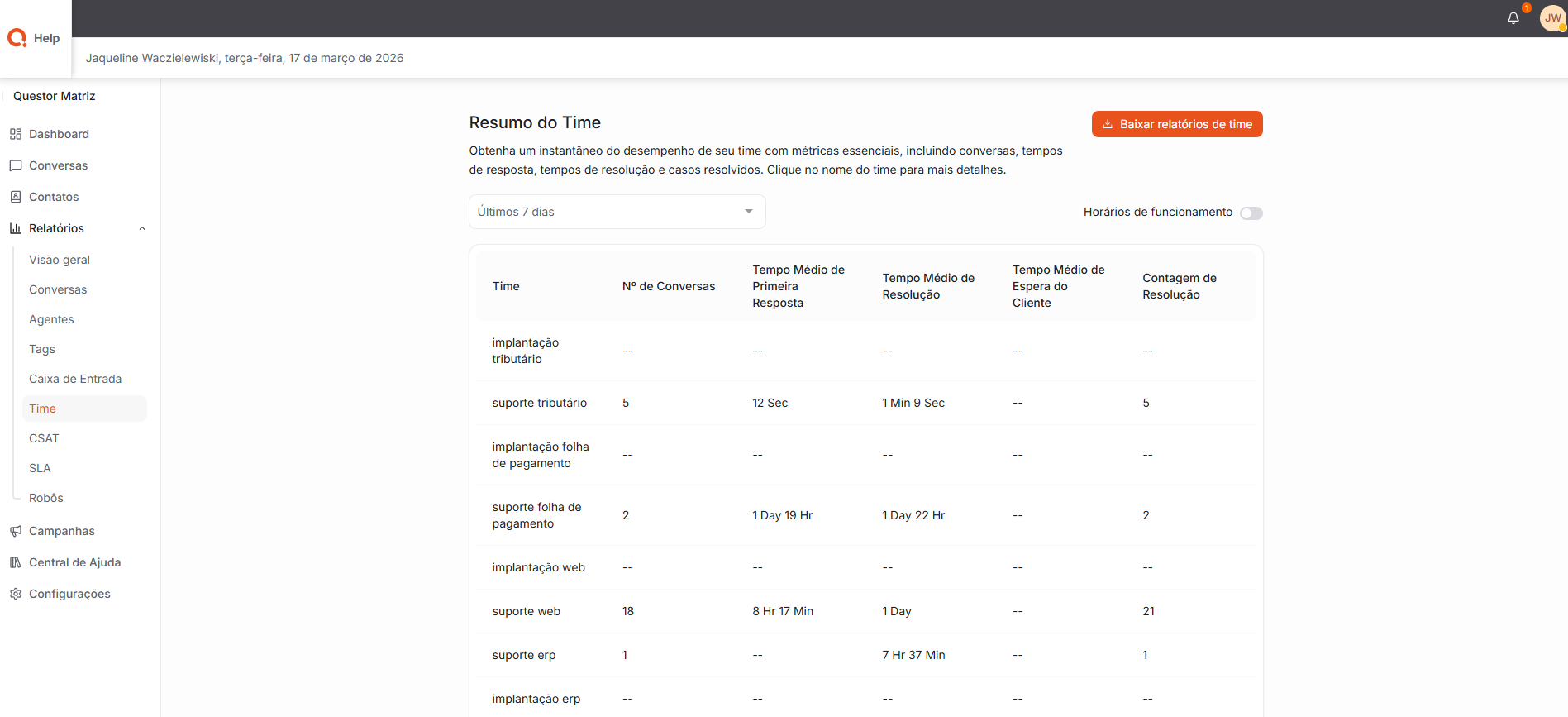 Times: Permite uma visualização geral do desempenho de cada time, apresentando métricas importantes como quantidade de conversas atendidas, tempos de resposta, tempos de resolução e casos resolvidos.