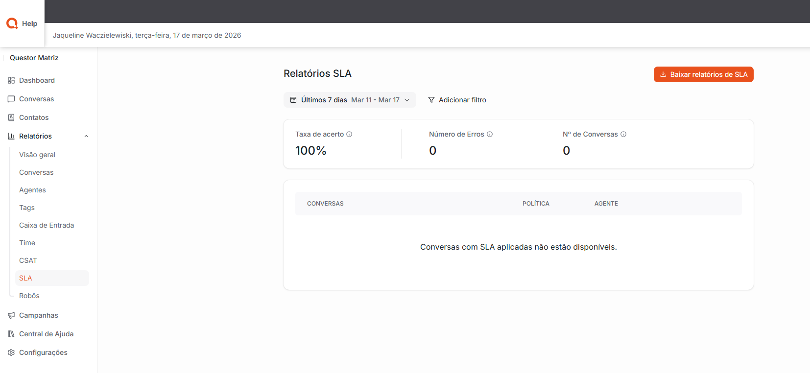SLA: Permite acompanhar os indicadores relacionados ao cumprimento dos Acordos de Nível de Serviço (SLA) definidos para os atendimentos. Nessa área, é possível verificar se os tempos de resposta e de resolução estão sendo cumpridos conforme os prazos estabelecidos.