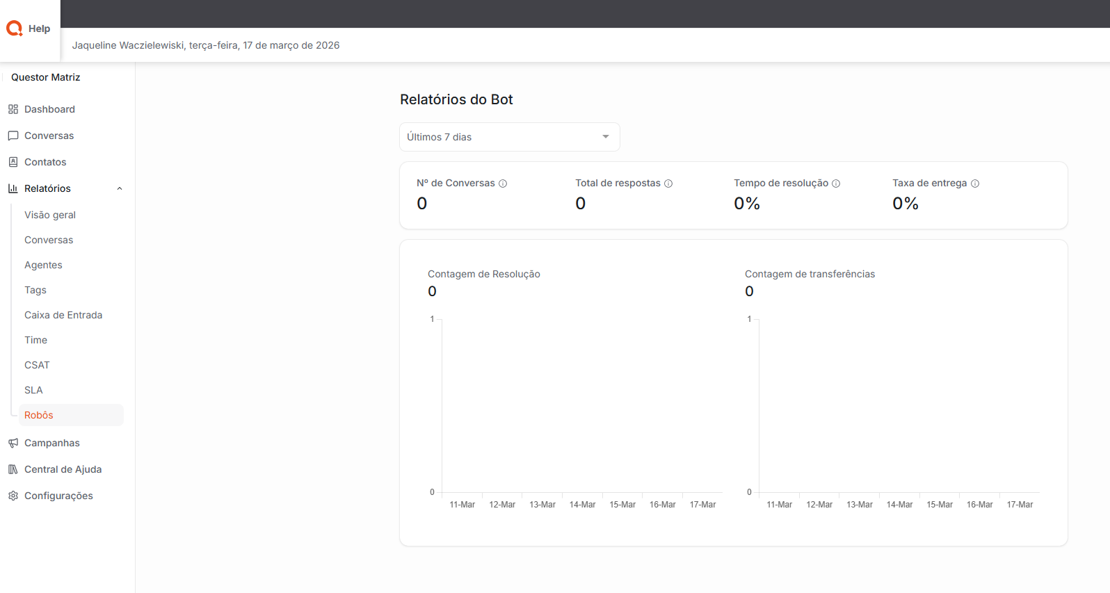 Robôs: Nesta área, é possível acompanhar dados e métricas relacionadas às interações realizadas pelo bot no sistema. Os relatórios permitem analisar informações como quantidade de atendimentos iniciados pelo bot, fluxos executados e interações com os usuários