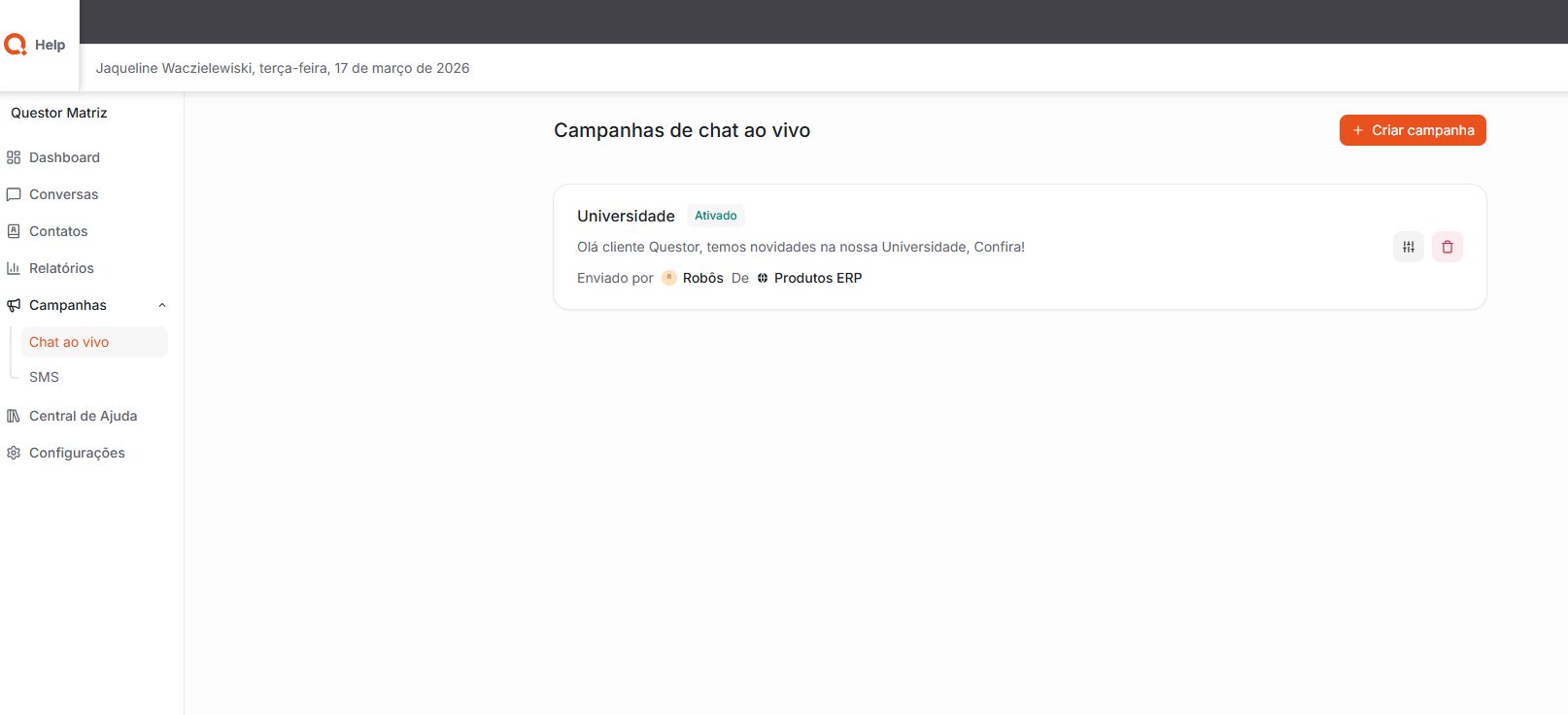 Campanhas: Nesta tela, é possível criar e gerenciar campanhas de chat ao vivo, permitindo o envio de mensagens em massa para os clientes. Essa funcionalidade facilita a comunicação com vários contatos ao mesmo tempo, sendo útil para divulgação de informações, avisos ou ações de relacionamento com os clientes.