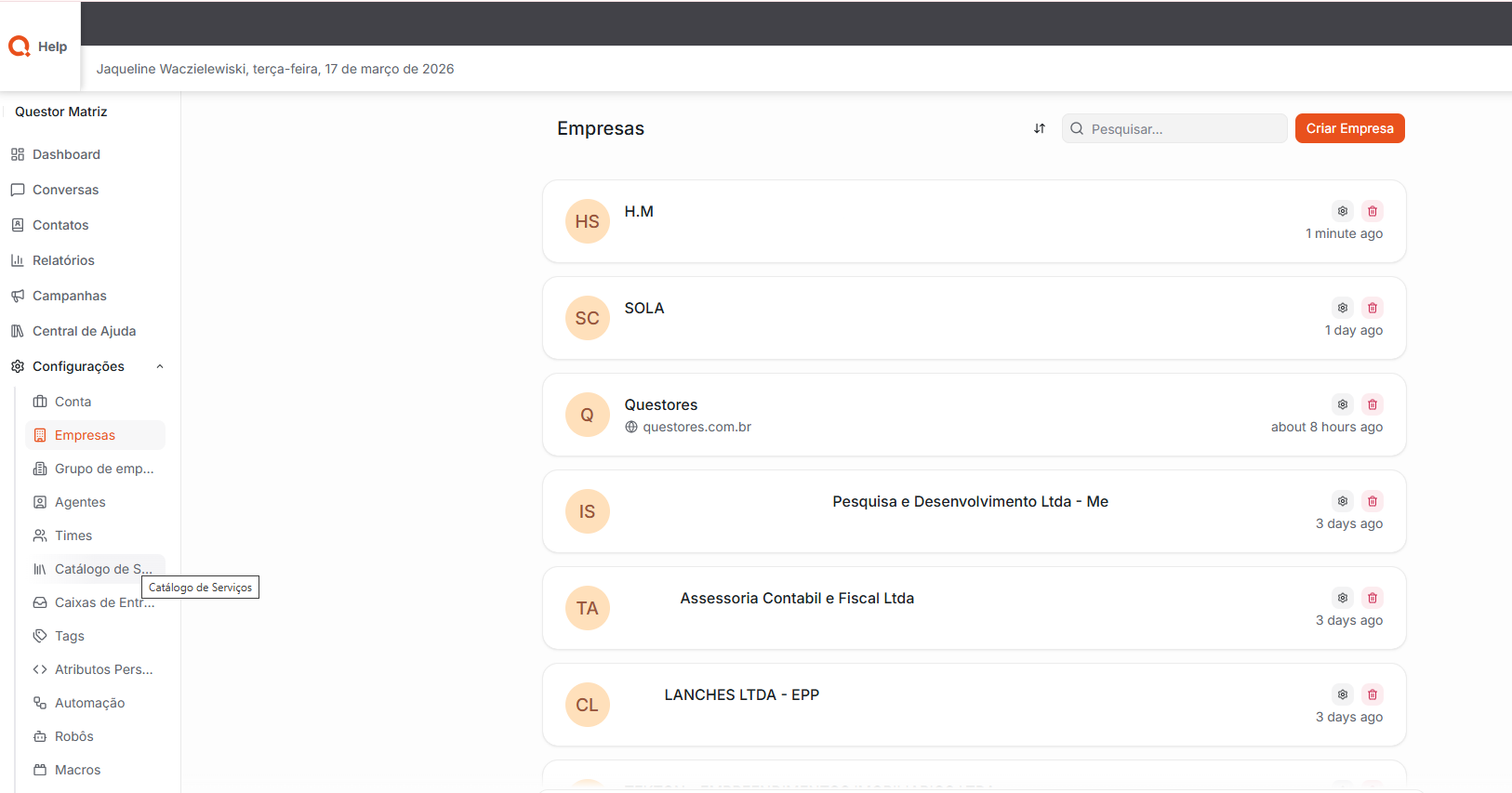 Empresas: Permite realizar a configuração, edição e criação de empresas cadastradas no sistema.