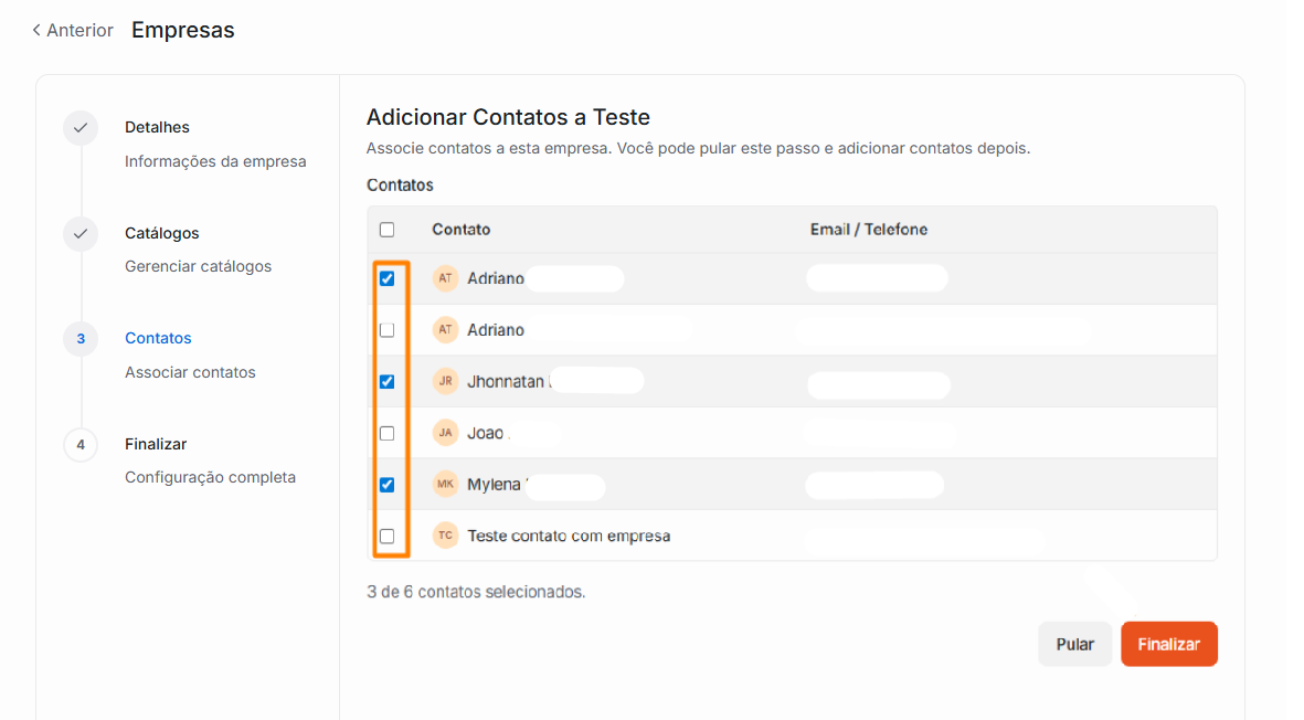 Você pode pular esta etapa e adicionar os contatos posteriormente. Para adicionar contatos, marque o checkbox dos contatos que deseja associar à empresa e, em seguida, clique em Finalizar.