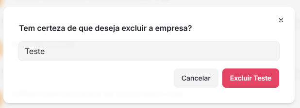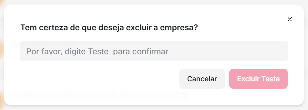 3. O sistema exibirá uma mensagem solicitando que você confirme a exclusão, digitando exatamente o nome da empresa no campo indicado. No próprio campo, haverá uma orientação sobre como ele deve ser preenchido. Veja o exemplo abaixo: