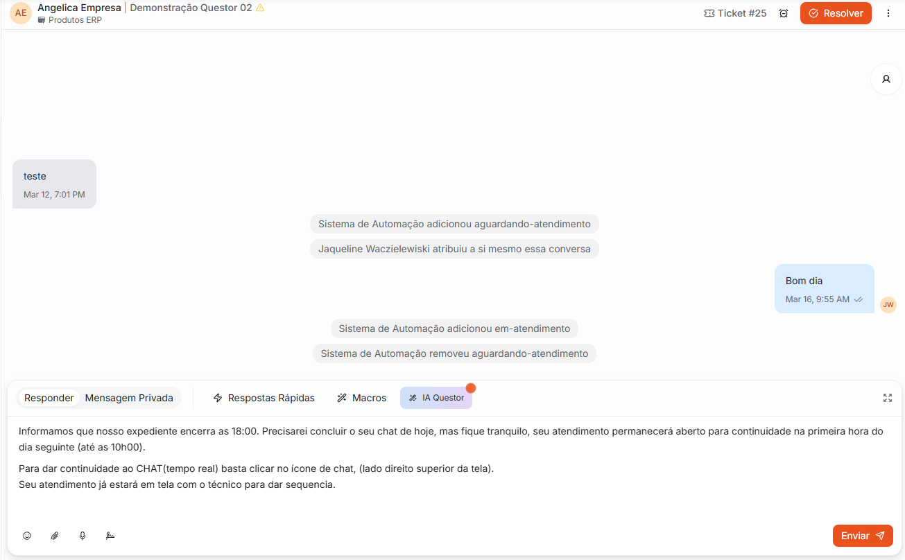 Ao clicar na mensagem desejada, ela será inserida na caixa de texto para envio. Para enviá-la, clique em Enviar.