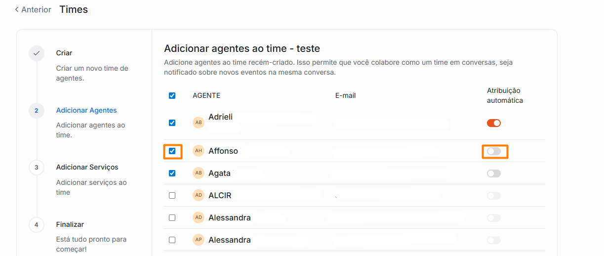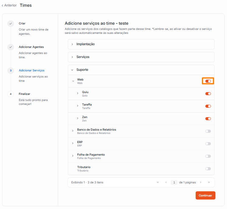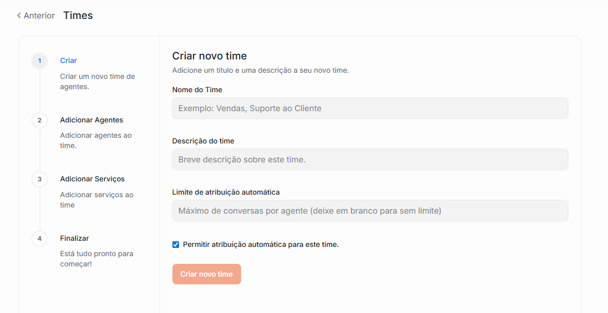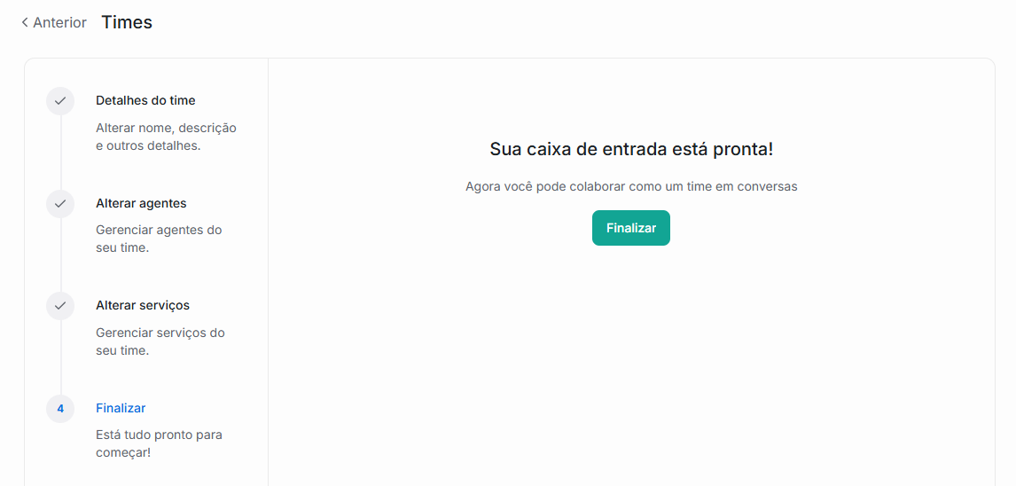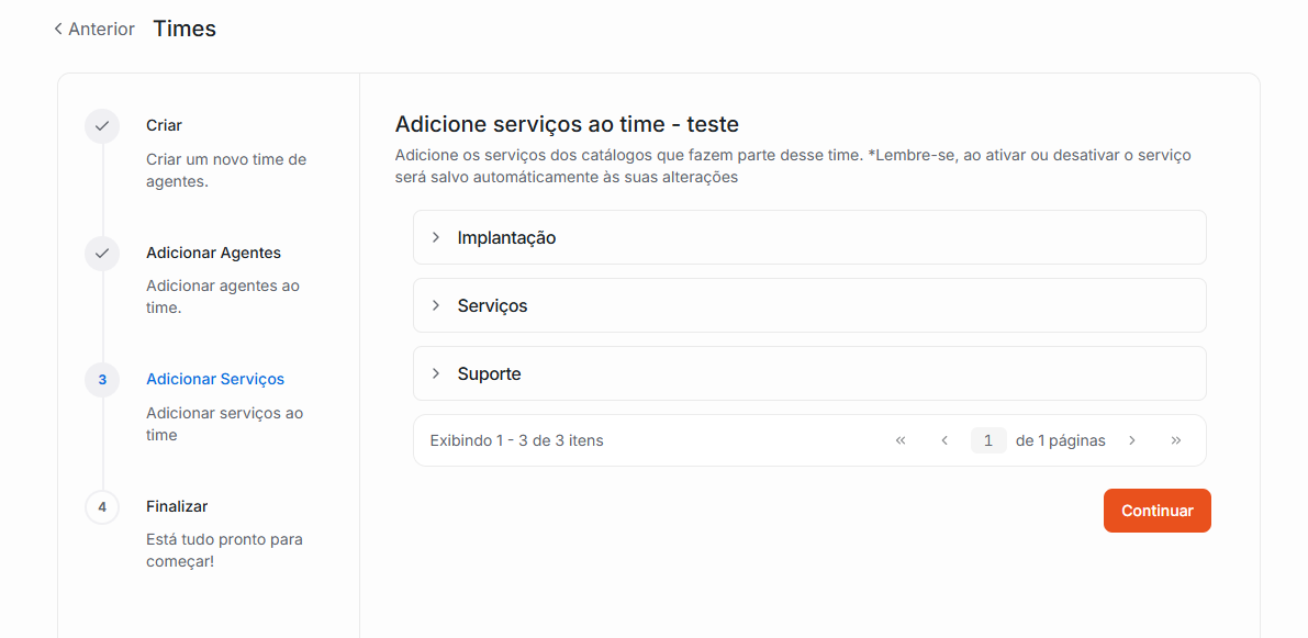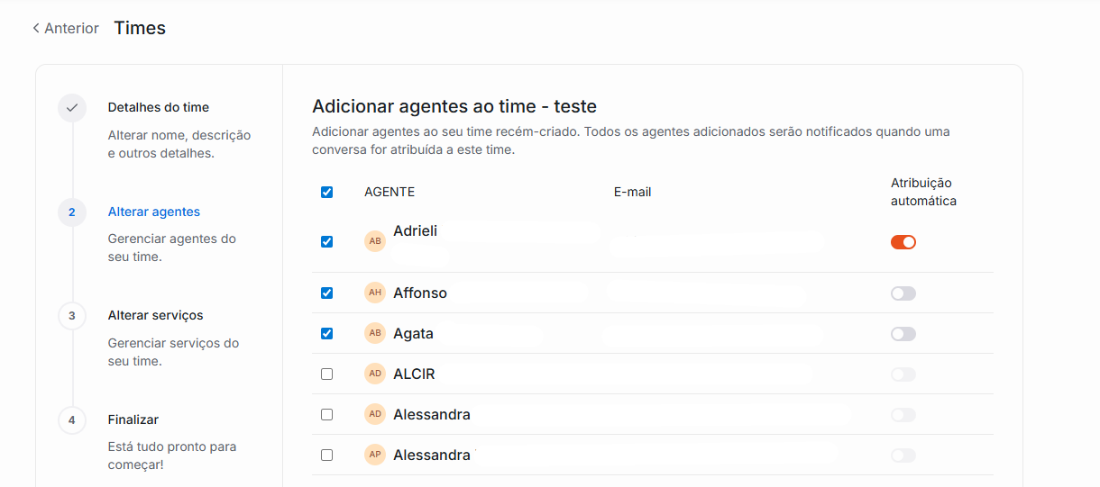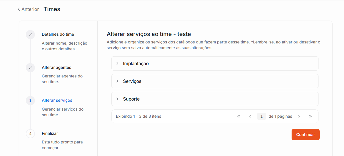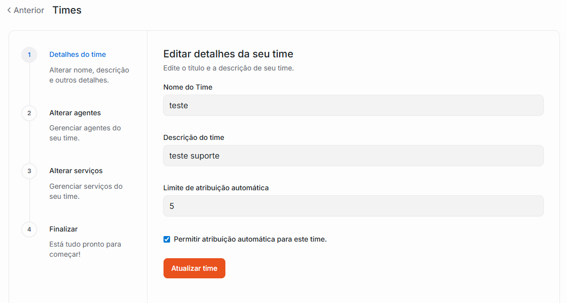 3. Você será redirecionado a seguir 4 etapas curtas: Detalhes do Time, Alterar agentes, Alterar serviços e Finalizar.