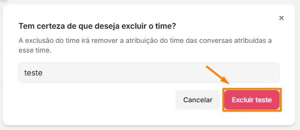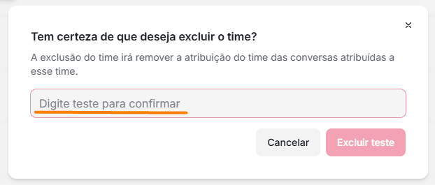 3. O sistema exibirá uma mensagem solicitando que você confirme a exclusão, digitando exatamente o nome da time no campo indicado. No próprio campo, haverá uma orientação sobre como ele deve ser preenchido. Veja o exemplo abaixo: