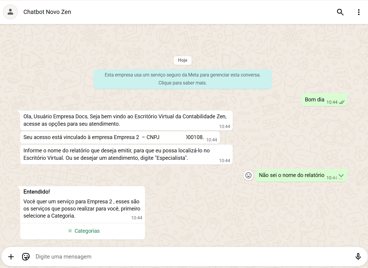 Ao interagir com o ChatBot, o cliente realiza a solicitação e, em poucos instantes, um robô processa o pedido e envia o relatório desejado diretamente pelo WhatsApp.